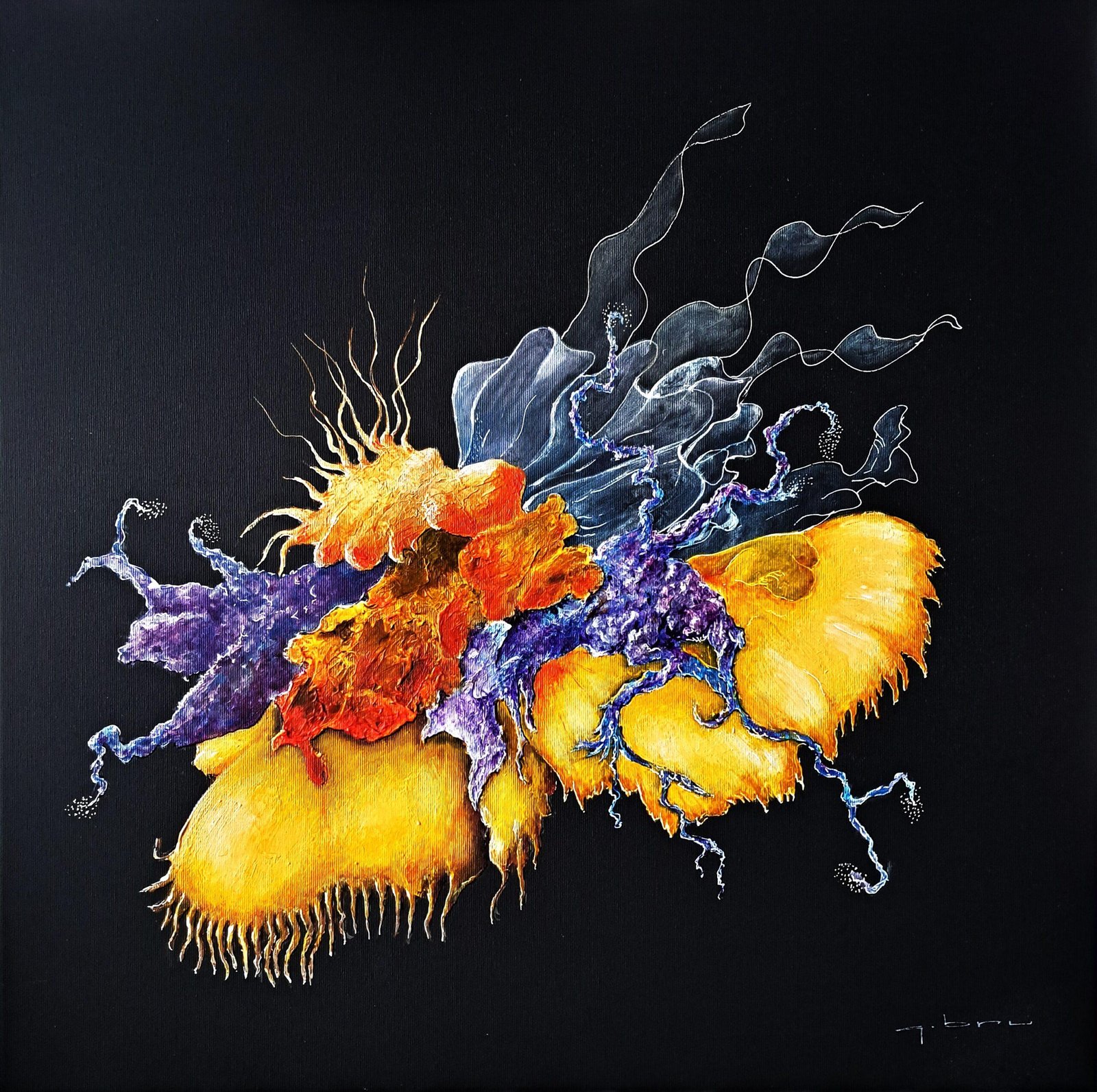 Pour la création de cette œuvre, l’artiste puise son inspiration dans les profondeurs abyssales peuplées d’étranges animaux aux couleurs et formes extravagantes. Toujours très attiré par les couleurs vives, il imagine une de ces créatures extraordinaires qui évoluent dans l’obscurité totale.