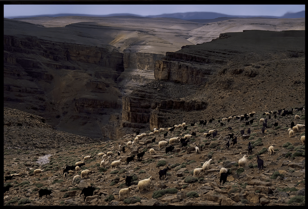 Une fresque de la Création, en noir et blanc. Des moutons, des chèvres, glissent entre les rochers. Ils s’y fondent. L’œil hésite. Parfois, je crois que les pierres bougent. Mais ce n’est pas la pierre — c’est un animal. La confusion est constante. Rien ne se distingue vraiment, tout se dissimule.