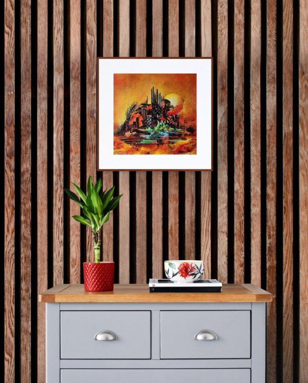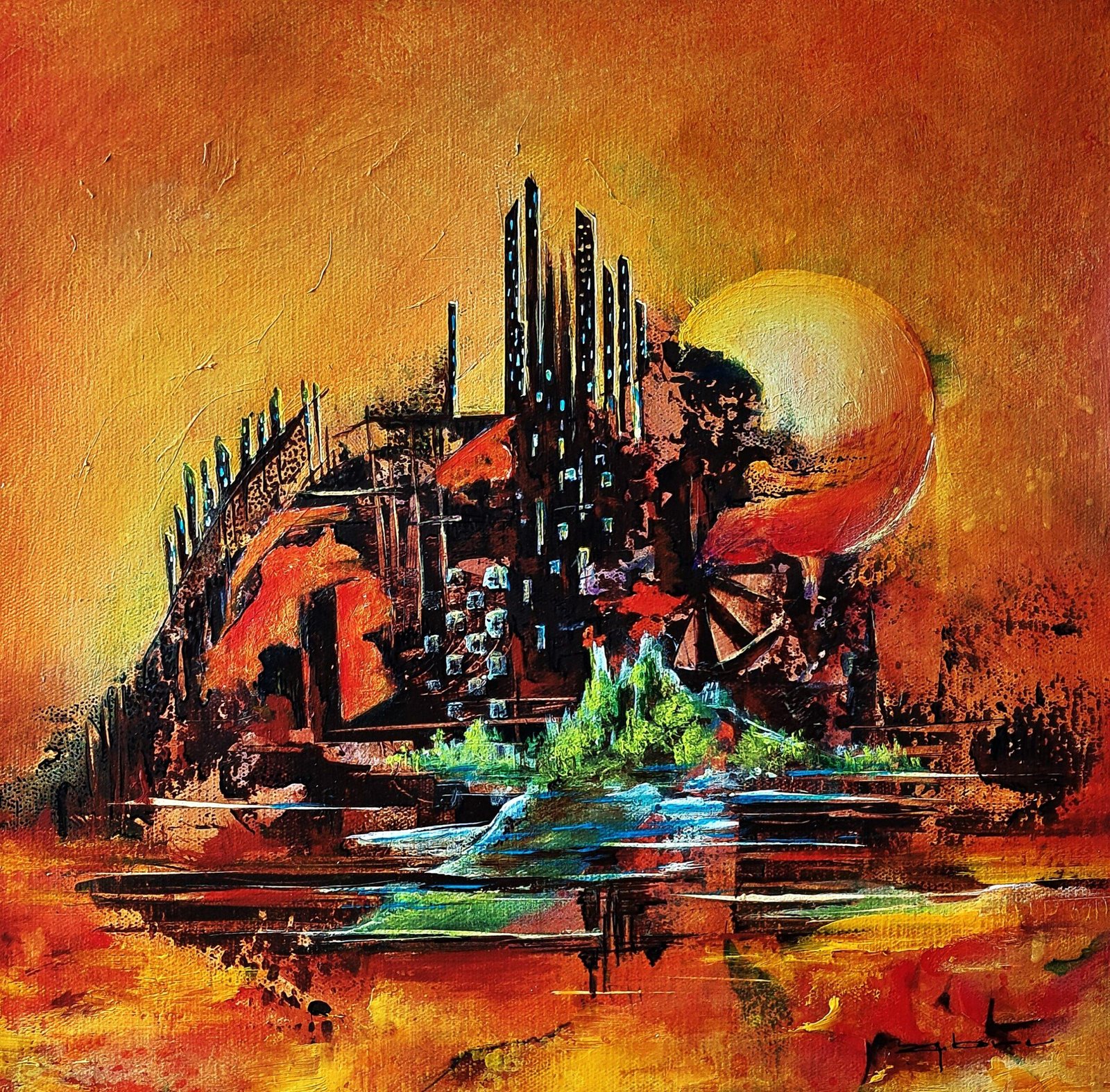 Dans cette œuvre, l’artiste imagine un espace abandonné par l’Homme et qui présente les stigmates des activités passées de ce dernier. Les silhouettes sombres de bâtis aux formes variées s’enchevêtrent et paraissent telles des carcasses devant un soleil rougeoyant, qui minimise la puissance de l’être humain face à son environnement.