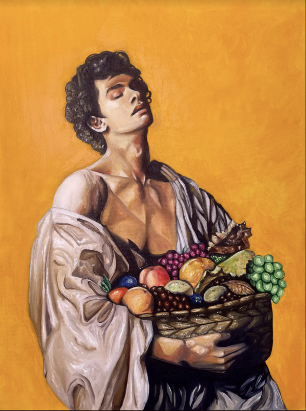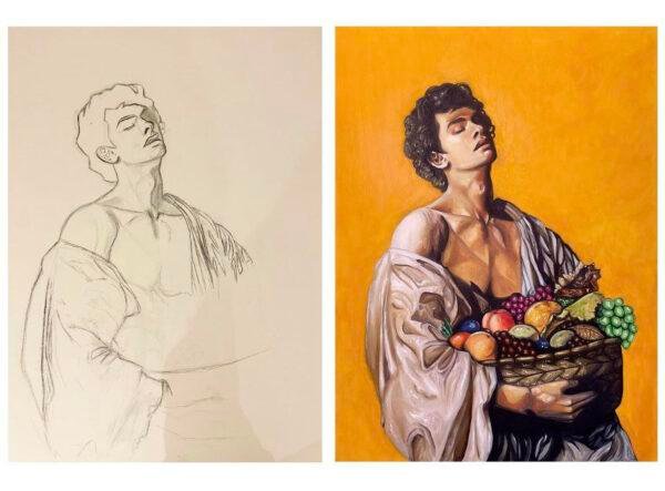 J’ai peint une nouvelle version du garçon avec un panier de fruits à partir de l’acteur Andrew Garfield qui pose en reproduisant l’œuvre de Caravage.