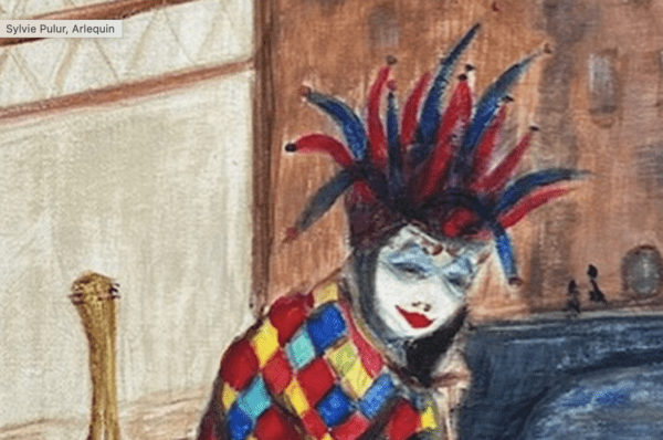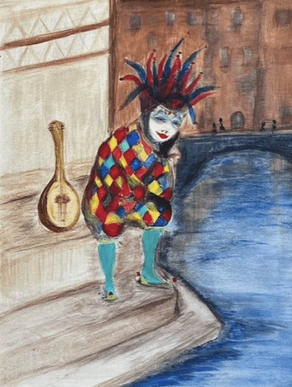 Cette œuvre captivante représente un personnage de bouffon coloré, vêtu d’un costume à losanges flamboyants, typique de la commedia dell’arte.