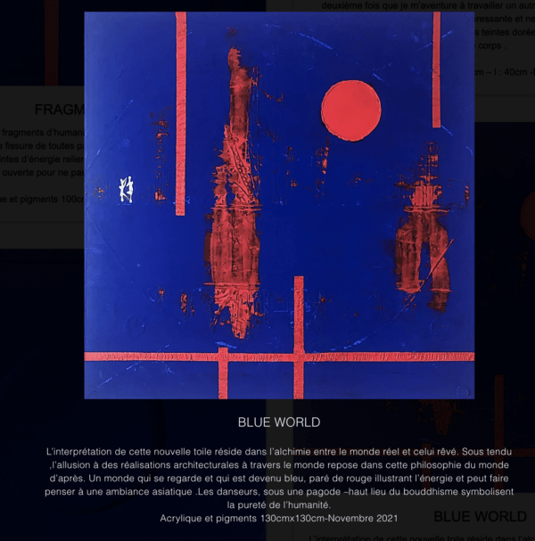 Un monde qui se regarde et qui est devenu bleu, paré de rouge illustrant l’énergie et peut faire penser à une ambiance asiatique .