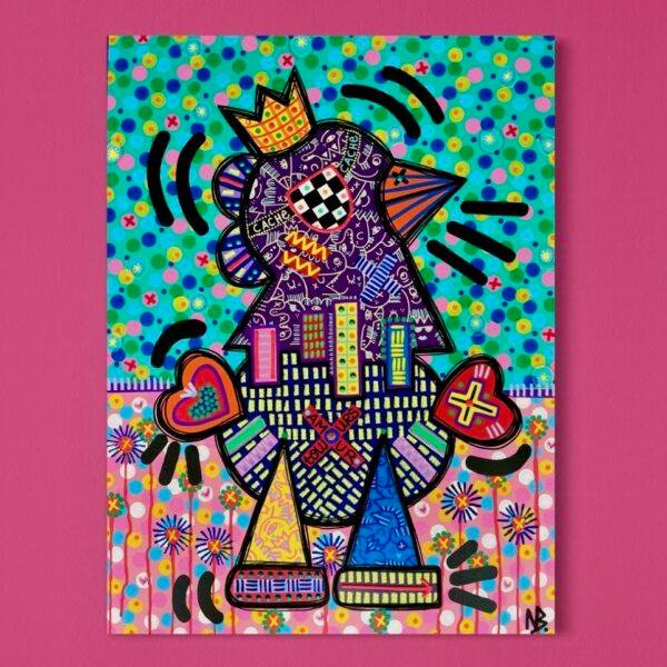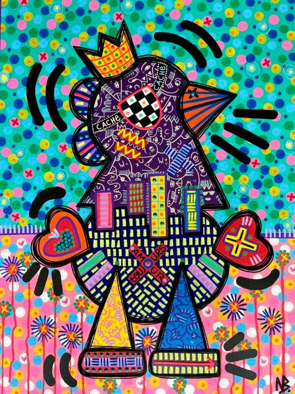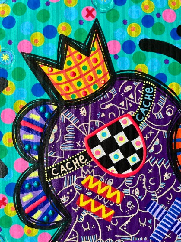 Les couleurs vivaces et les motifs diversifiés, réalisés en technique mixte (acrylique, gouache, pastel gras et craie), évoquent un esprit de liberté rempli d’énergie comme celui d’un enfant dans une cour de récréation, tout en donnant au sujet un aspect totémique, presque royal.