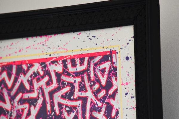 Bombe de peinture sur cadre, peinture acrylique et Posca sur papier entoilé et passe partout.