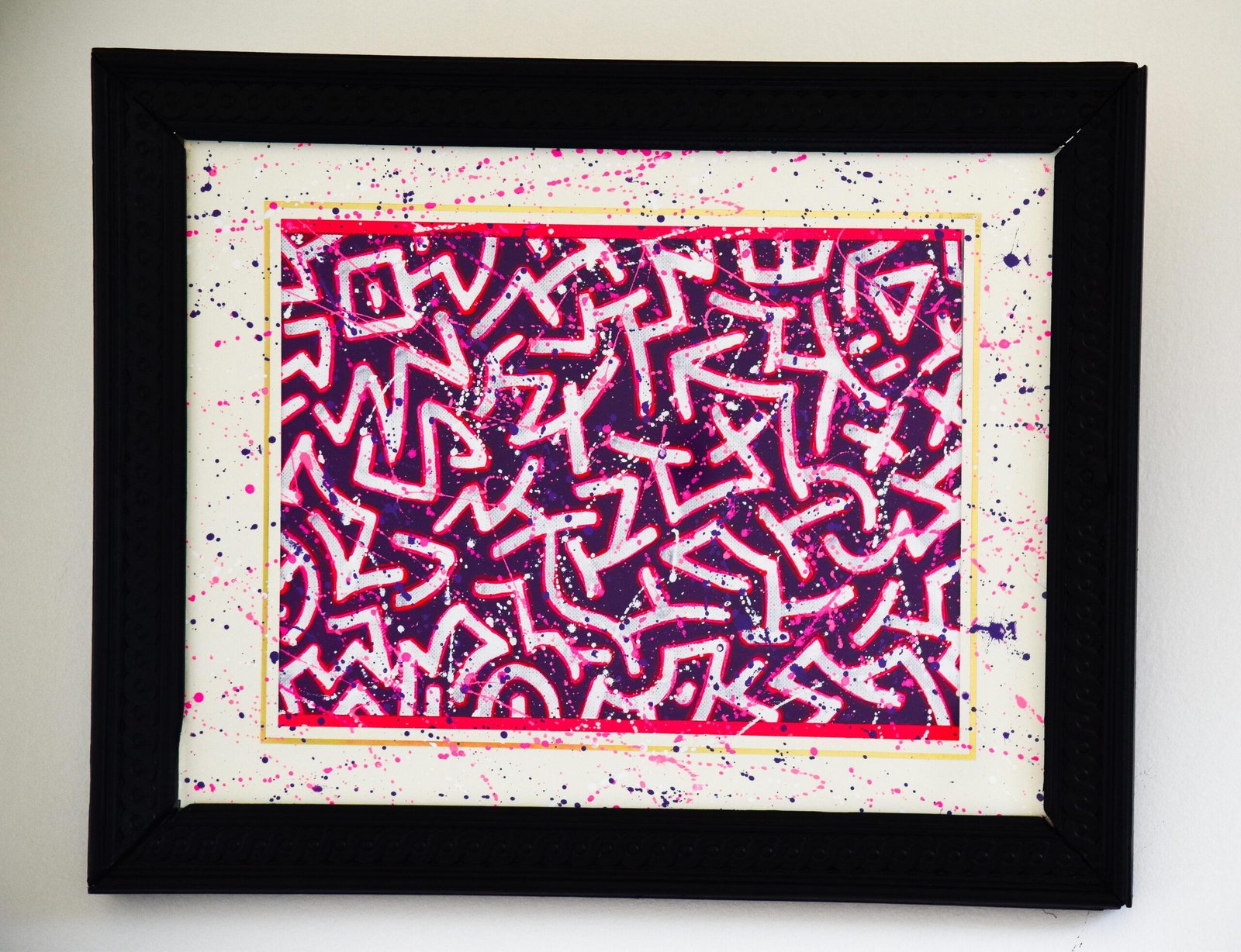Bombe de peinture sur cadre, peinture acrylique et Posca sur papier entoilé et passe partout.