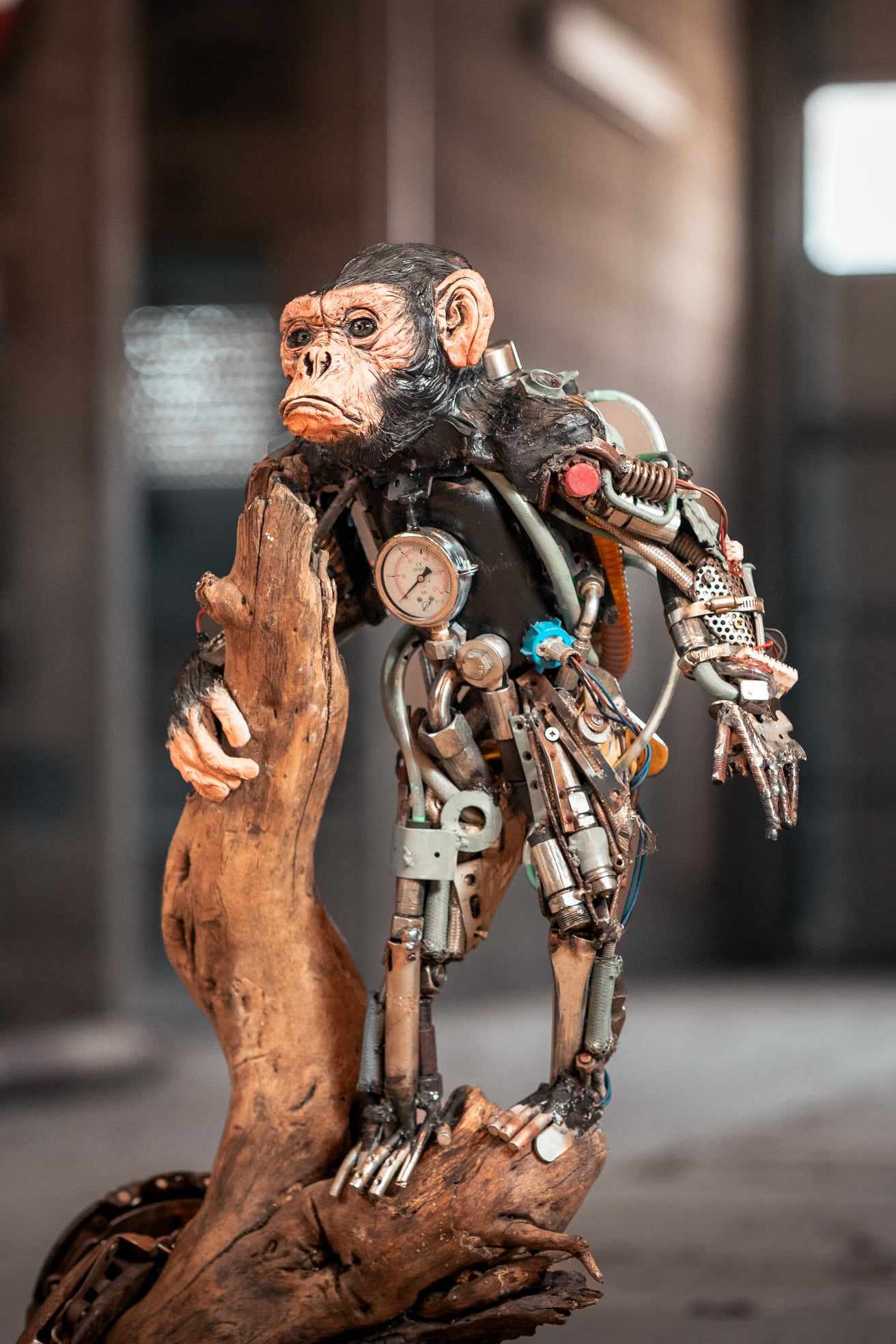 Cyberg Monkey est une sculpture cyberpunk-biologique représentant un singe hybride, fusionnant chair et mécanique dans un équilibre saisissant entre nature et technologie.