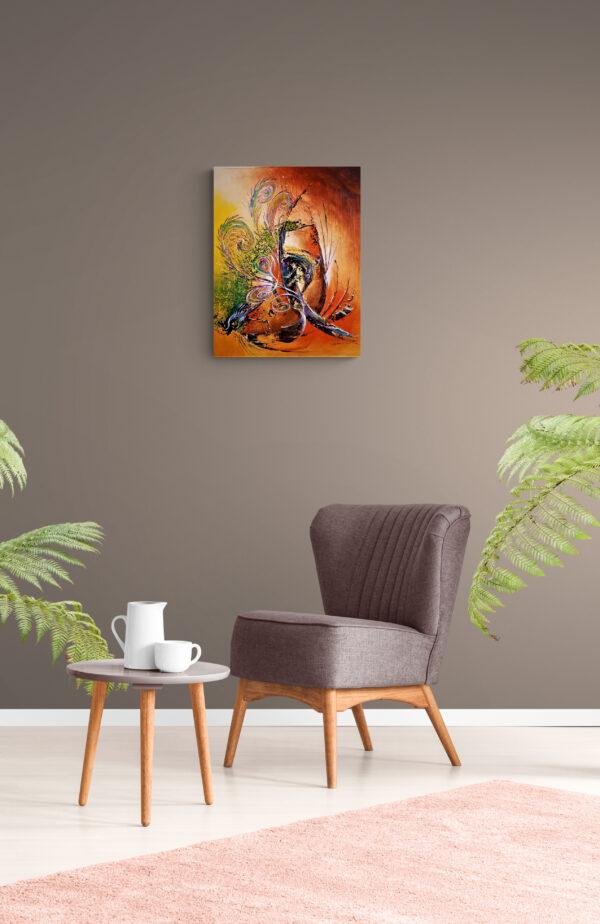 L’artiste propose une vision de la domination avec la présence suggérée d’une sorte de rapace imaginaire pouvu des plumes envoûtantes de paon. Cet animal au bec accéré tend ses pattes recouvertes de plumes en avant en signe de possession