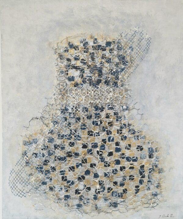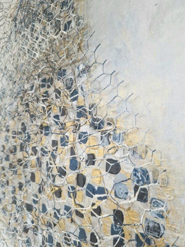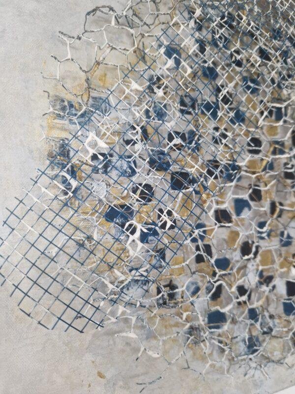 Entre matière et transparence, la toile évoque une structure qui se défait, une énergie qui circule, un équilibre fragile entre ordre et désordre.
