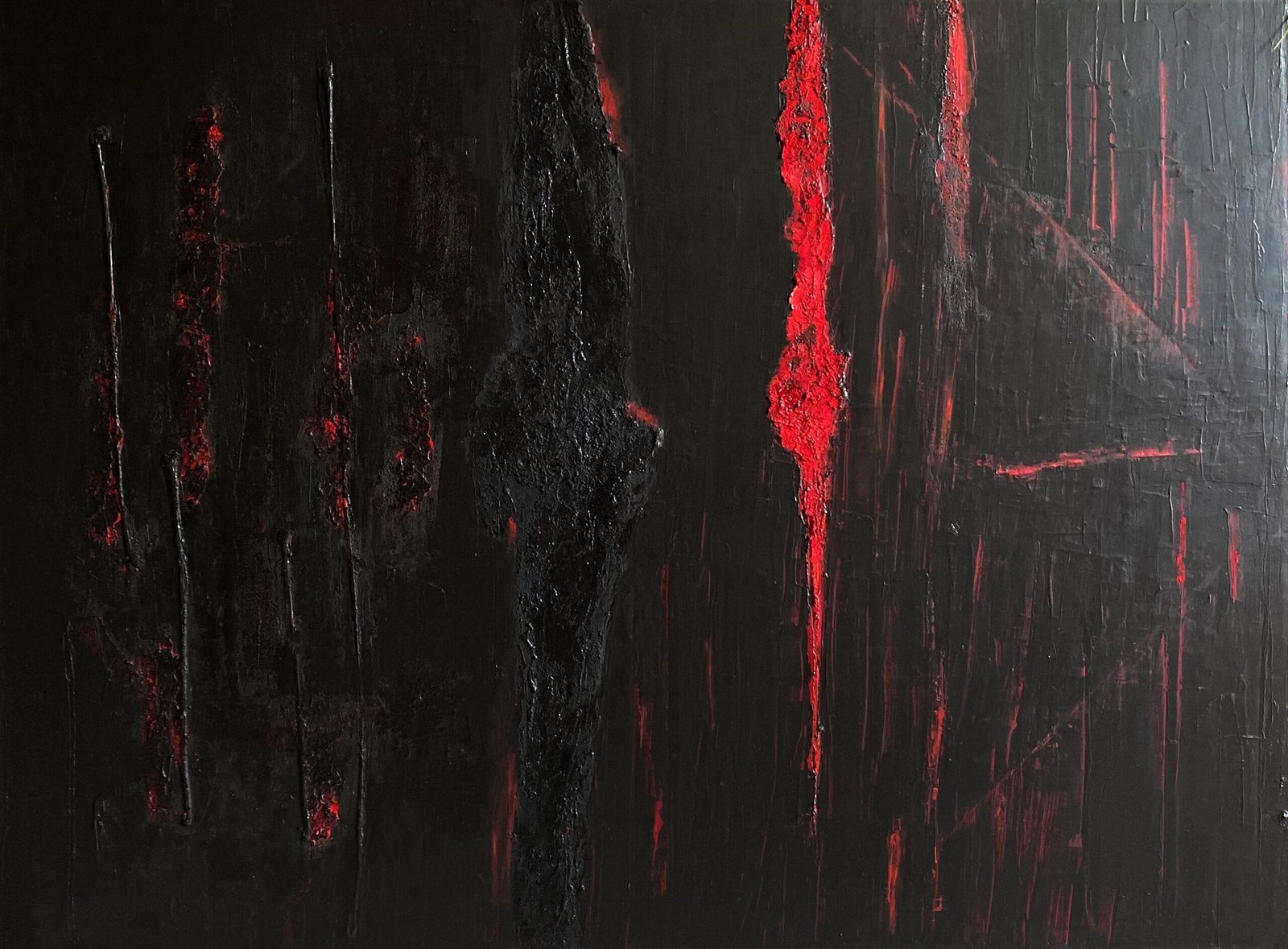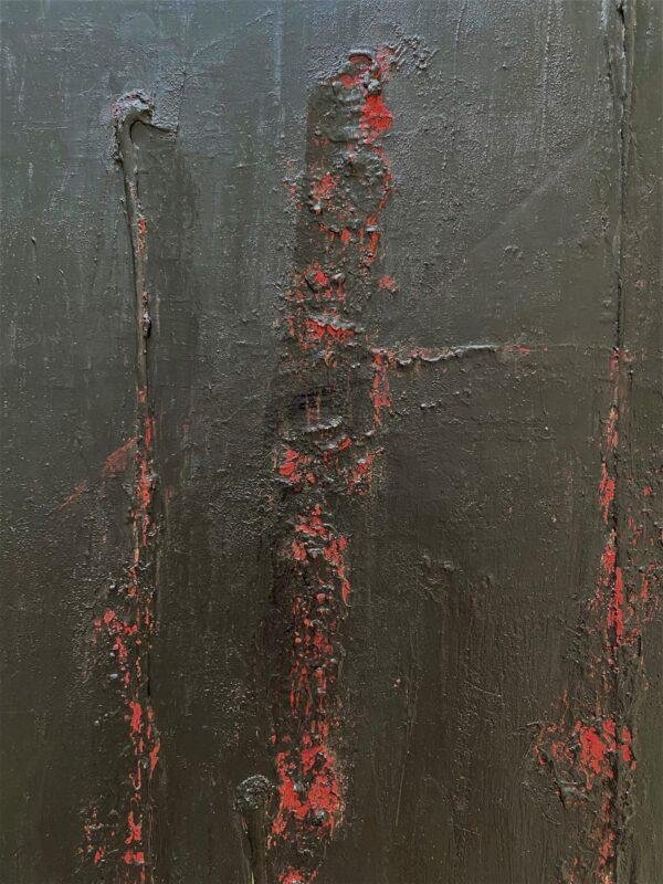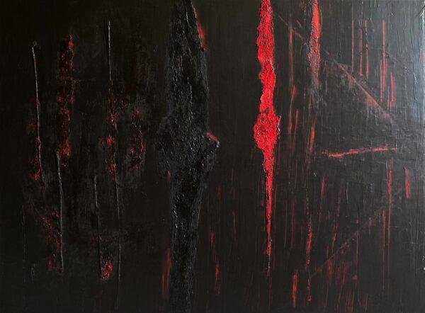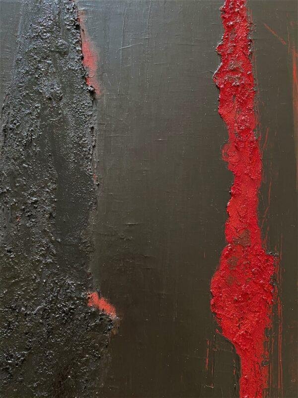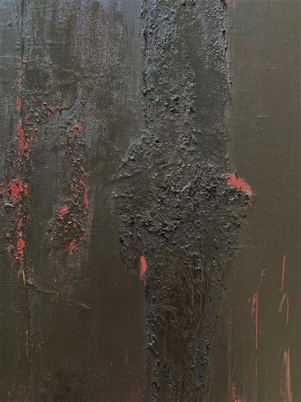 Tout au long de la réalisation de cette toile, j’ai eu un sentiment de renaissance, de renouveau, comme une éclosion, donc une vraie émotion positive, malgré la noirceur apparente…