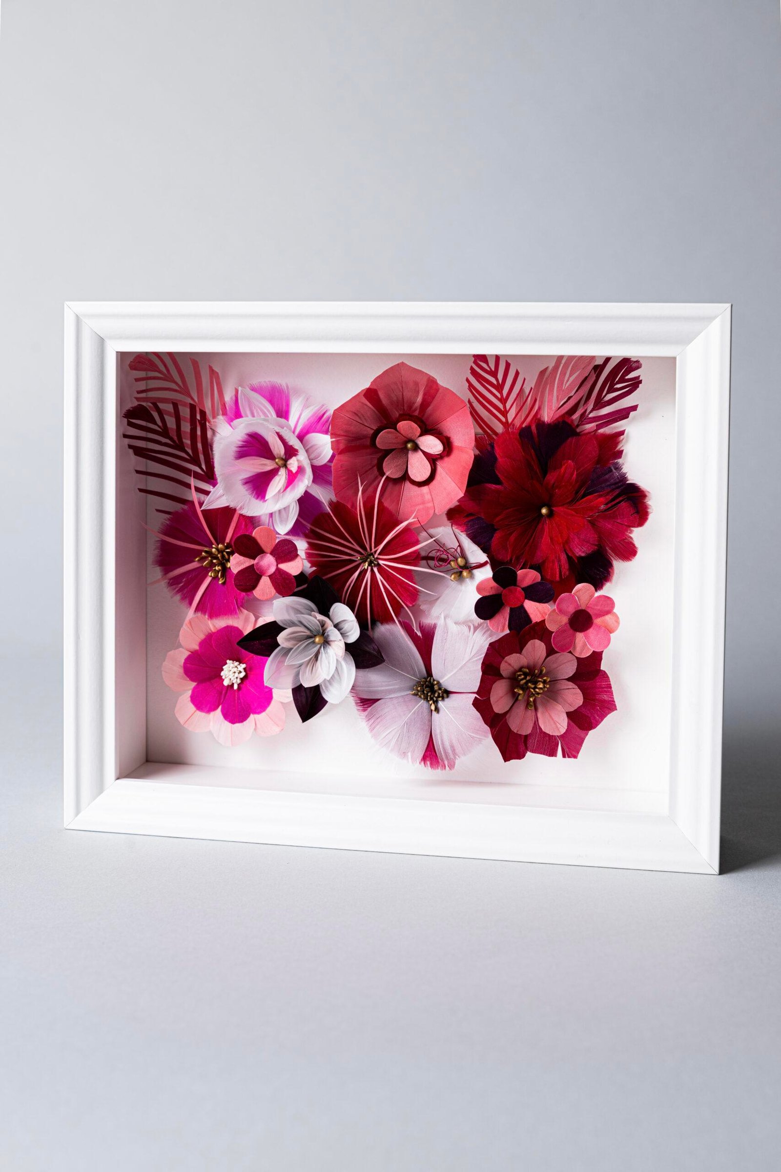 Une ode à la nature revisitée en plumasserie. Rose, vivante, captivante, toutes ces fleurs sont faites de plumes.