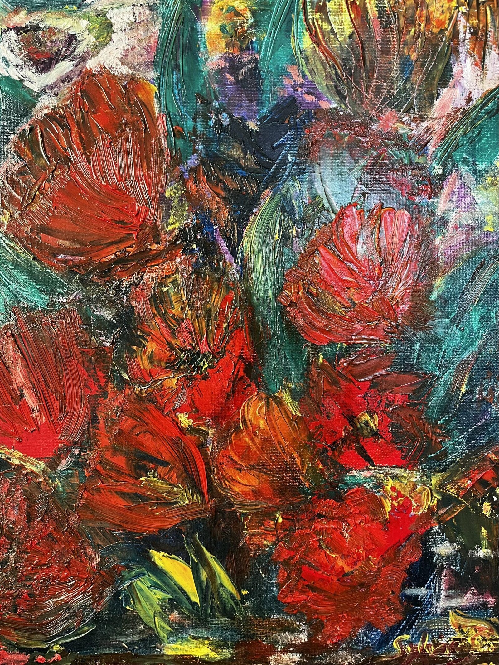 Sur l’idée d’une explosion d’un bouquet, j’ai souhaité la représenter avec des couleurs ardentes mélangeant l’abstrait et le réalisme.