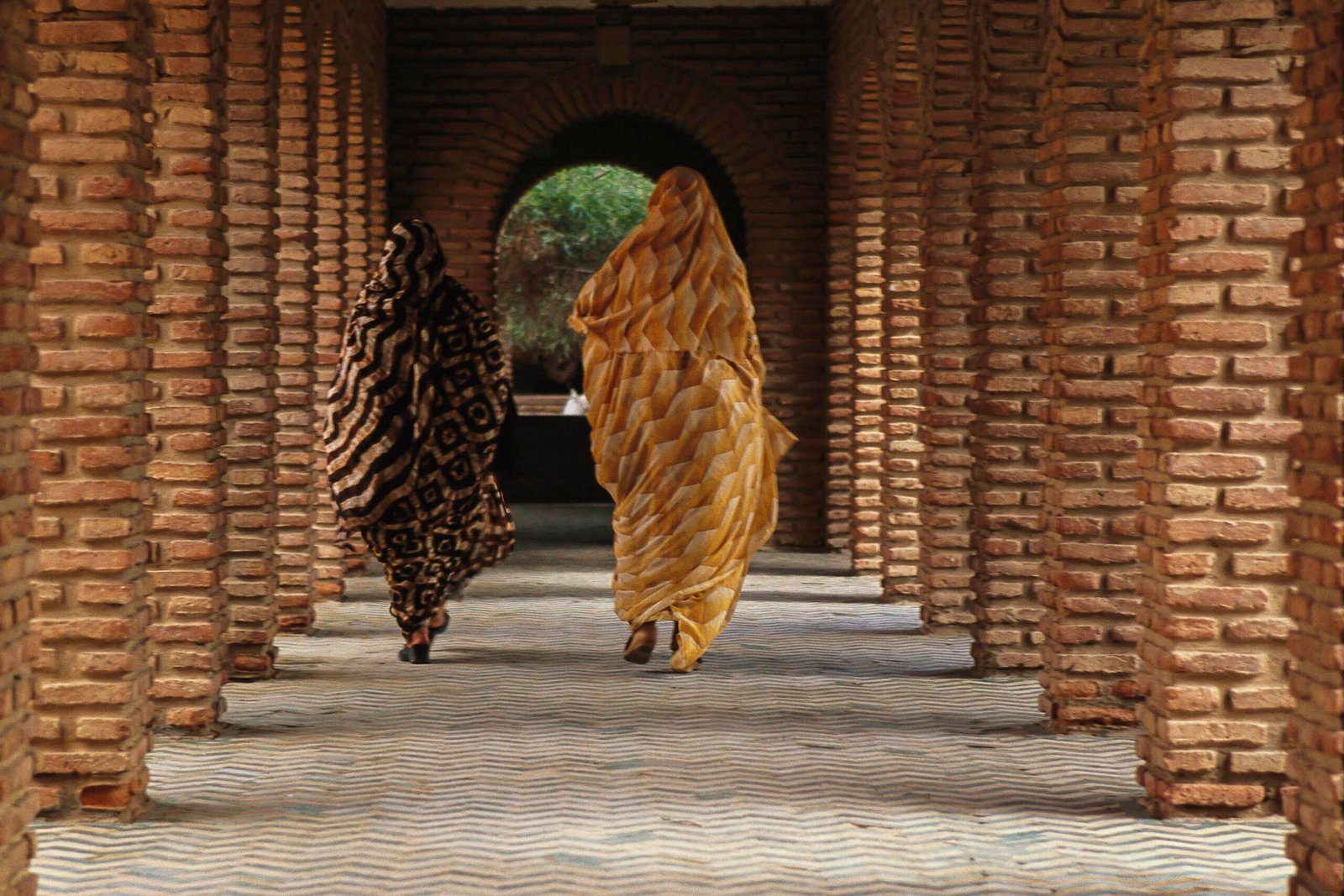 La bourgade est devenue une ville de quelque 250 000 habitants. Effet caméléon dans ce camaïeu de brun et de beige, les briques comme les étoffes sont d’une rare élégance. Drapées à l’identique, les deux amies, qui sortent sans doute d’un de ces ateliers d’artisanat qui animent la jeune capitale, vont disparaître dans les briques qui leur ressemblent : c’est un mirage, citadin, aux portes du désert des vrais mirages.