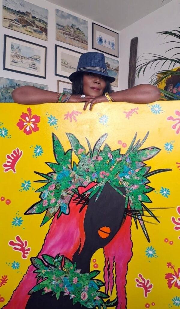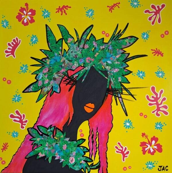 Oeuvre éclatante représentant une femme noire stylisée, parée de feuillages tropicaux et de fleurs . Sur un fond jaune vibrant décoré de motifs floraux ,elle incarne la beauté naturelle et l’identité insulaire.