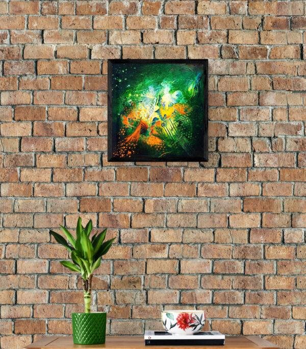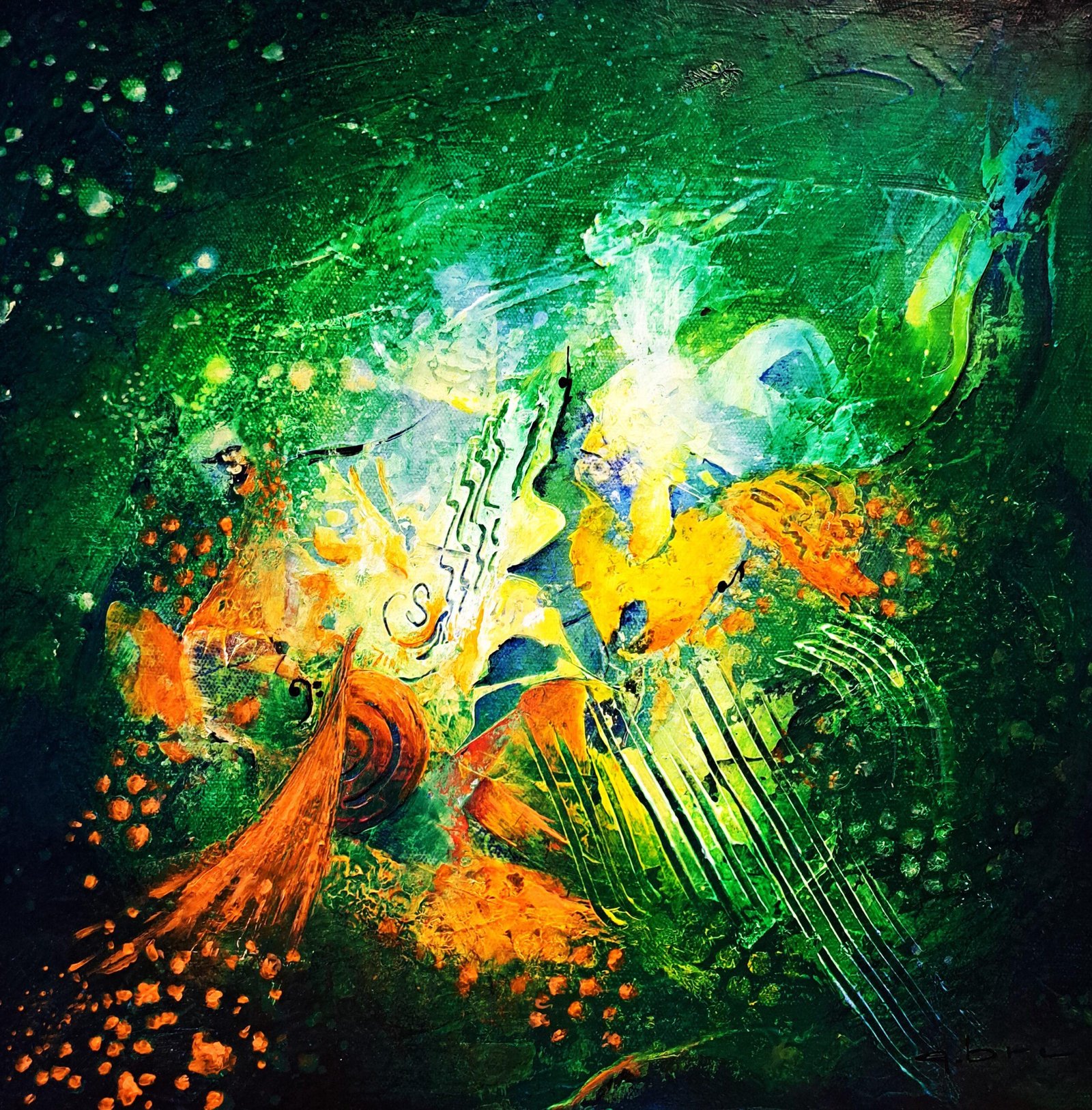 Le vert évoque la robe de sa bien-aimée tandis que le blanc décrit son corsage de satin. Quelques notes de musiques s’échappent de l’ensemble.