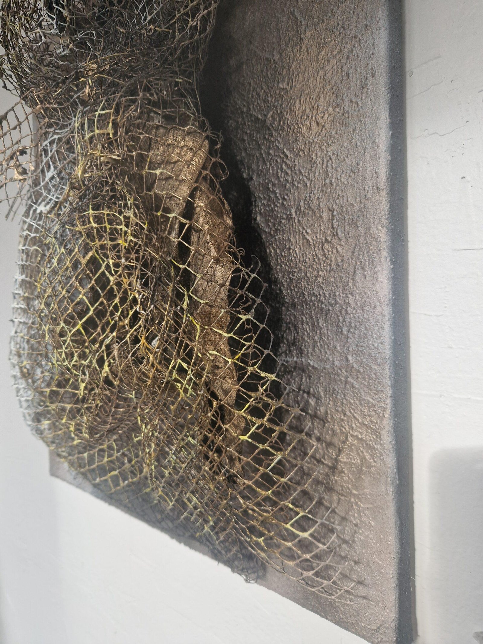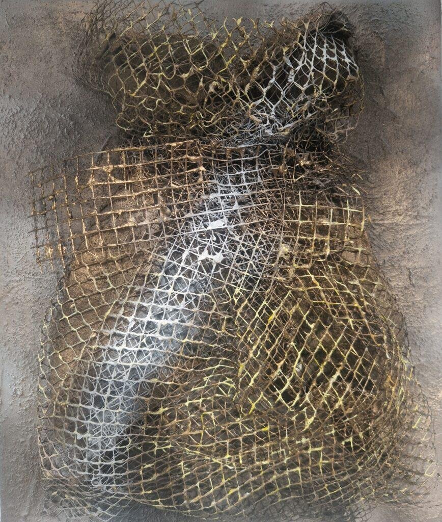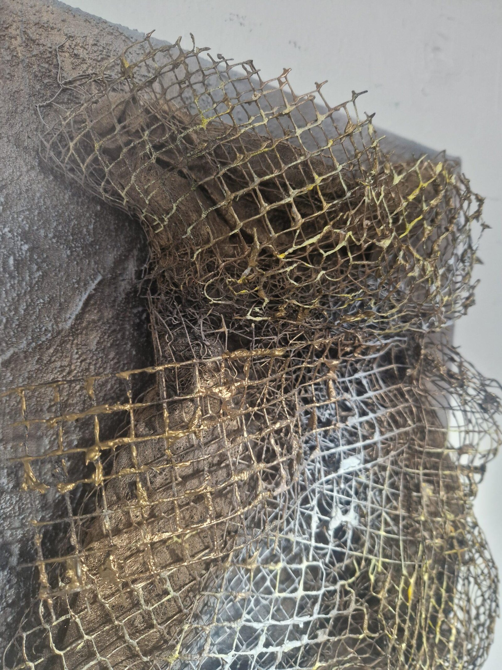 Une robe de grillage, traversée d’une ligne blanche se dresse comme un éclat de lumière pris dans un treillis de métal.