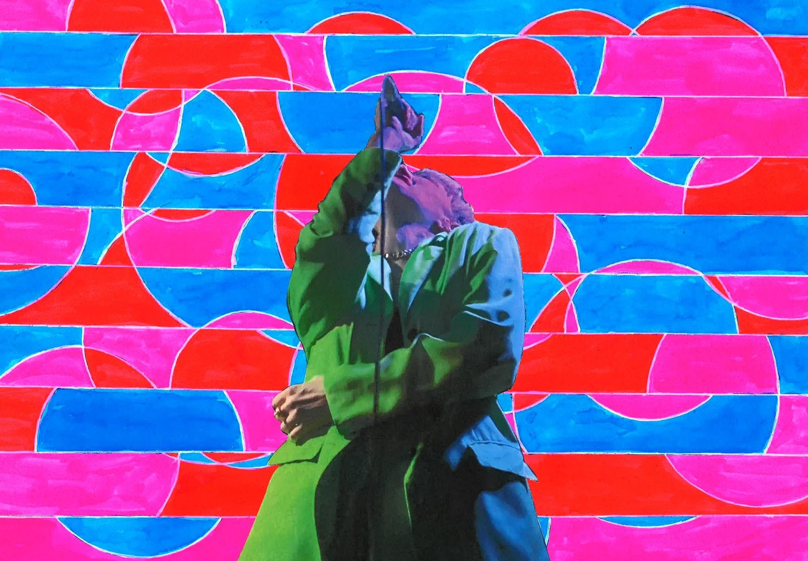 L’ensemble donne un effet de mouvement : la première image, sur la gauche, montre Gervaise de face, le micro à la main en pleine performance. Celle de droit, la montre sur le côté, presque de dos. Le micro qu’elle tient fait le lien entre les deux parties de la composition et laisse imaginer la manière dont Gervaise occupe l’espace de la scène. Le choix d’un fond dans les tons jaunes permet de créer un contraste avec le bleu du personnage, accentué par la forte luminosité du fond et la clair-obscur des photos de Gervaise, qui rappelle les œuvres de la fin de carrière de Magritte.