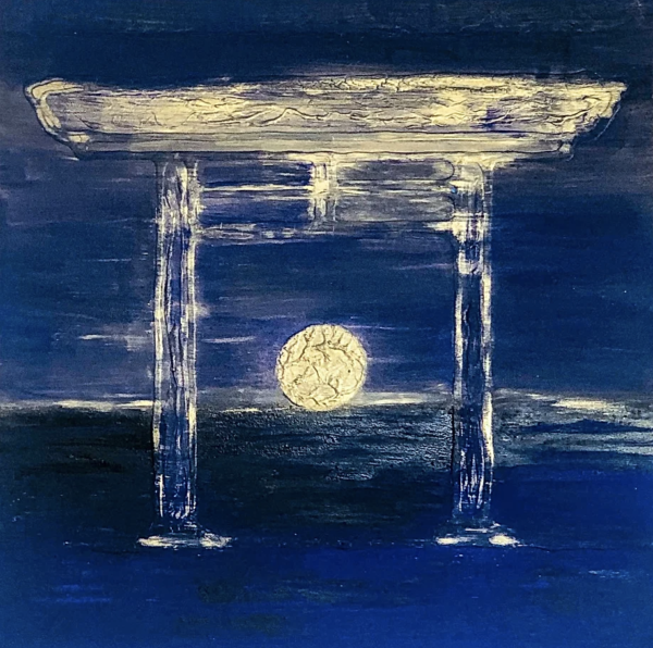 L’impression de ce tableau … rassurant , apaisant , laisse notre imaginaire fonctionner Le Torii ou portail japonais est communément érigé à l’entrée de sanctuaires . Il symbolise la séparation entre le monde sacré et celui du profane . Celui -ci représente l’accès entre notre monde terrestre et celui des éléments marins .