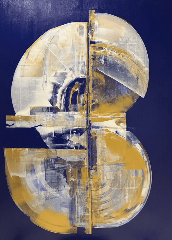 KOS est une œuvre abstraite aux tons bleu profond, blanc et or, évoquant la lumière éclatante et l’héritage artistique de la Grèce.