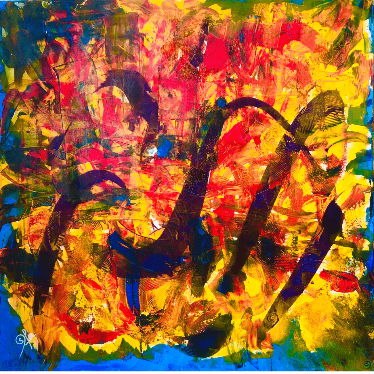 Peinte dans un moment de vie difficile de l’artiste, on peut y voir une certaine tourmente (dominance du rouge), des passions déchaînées et activées par la force du jaune. Mais au milieu de la toile comme occupant tout l’espace, comme émergeant de la toile, des lignes courbes en violet, venues apaisées la tourmente. Dans l’amour universel, elles forment entre elles en calligraphie ancienne, le nom de Dieu . Le bleu, spirituel et paisible entoure l’œuvre comme pour la calmer et la protéger.