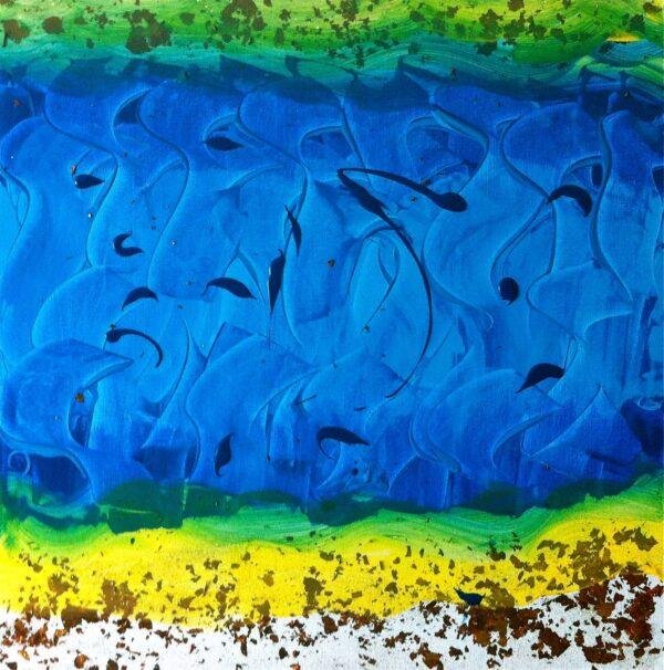 A l’instar de l’eau qui est la source de toute vie dans notre dimension materielle, nos âmes vivent dans la dimension infinie et fertile de l’univers, le spirituel – ici represente en bleu. C’est dans le faisceau énergétique continu et universel (bleu) qu’évoluent nos âmes avec force et paix ( jaune et vert) dans l’univers (blanc et doré).