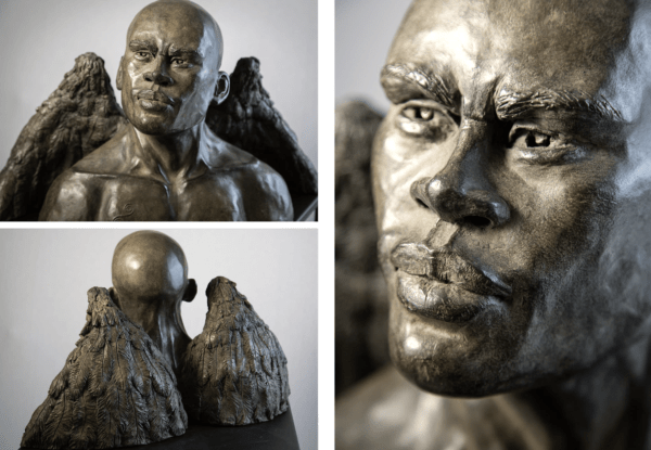 Aimer la plume pour sa complexité, aborder le sujet puis sculpter des ailes et en arriver à cet Ange chauve, noir et typé affranchi des références iconographiques traditionnelles.