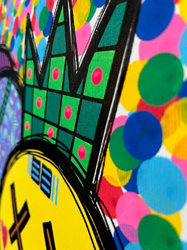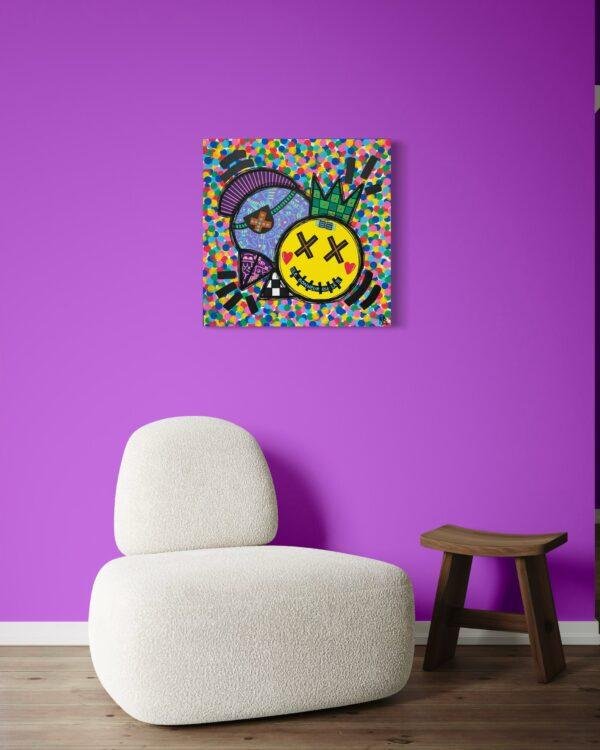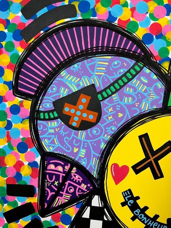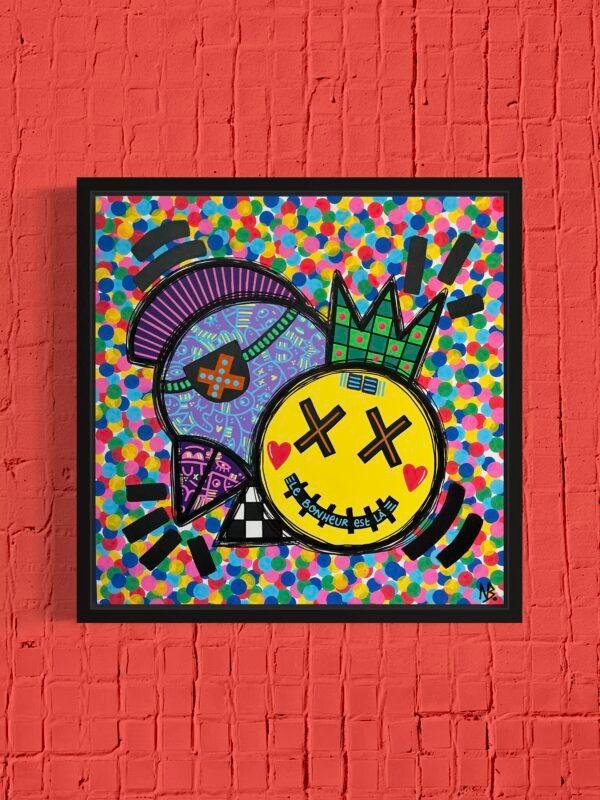 Dans cette œuvre, j’ai laissé libre cours à mon amour pour les couleurs vives et le dynamisme. Utilisant l’acrylique, j’ai fusionné le cubisme avec un style naïf et un pop art intrépide. Chaque élément géométrique, des formes audacieuses au fond joyeusement pointillé, vibre avec une vie propre, symbolisant la joie et la spontanéité. « Le bonheur est là » résume cette célébration de l’énergie positive, un rappel quotidien que le bonheur est toujours accessible, peint dans un kaléidoscope de couleurs éclatantes qui illumineront n’importe quel espace de vie.