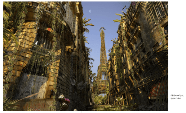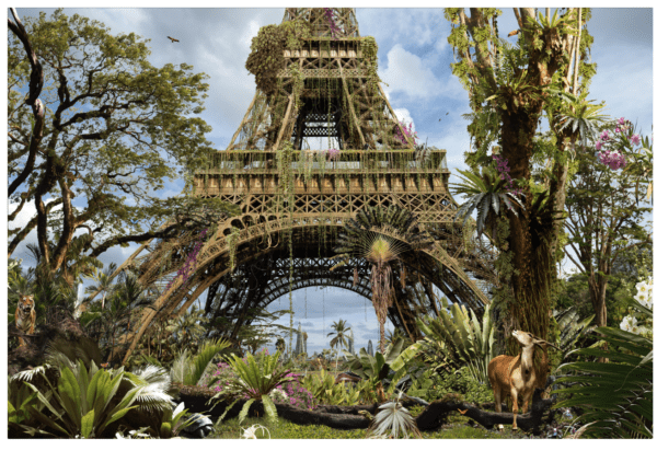 Chris ne se contente pas de reproduire des scènes ou des paysages ; il transforme la réalité pour la sublimer , y injectant une vison utopique ,où les frontières entre l’humain , l’animal et le végétal sont floues , et où la nature reprend le contrôle, envahissant et réappropriant des lieux historiques et iconiques ….