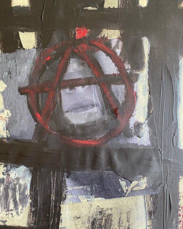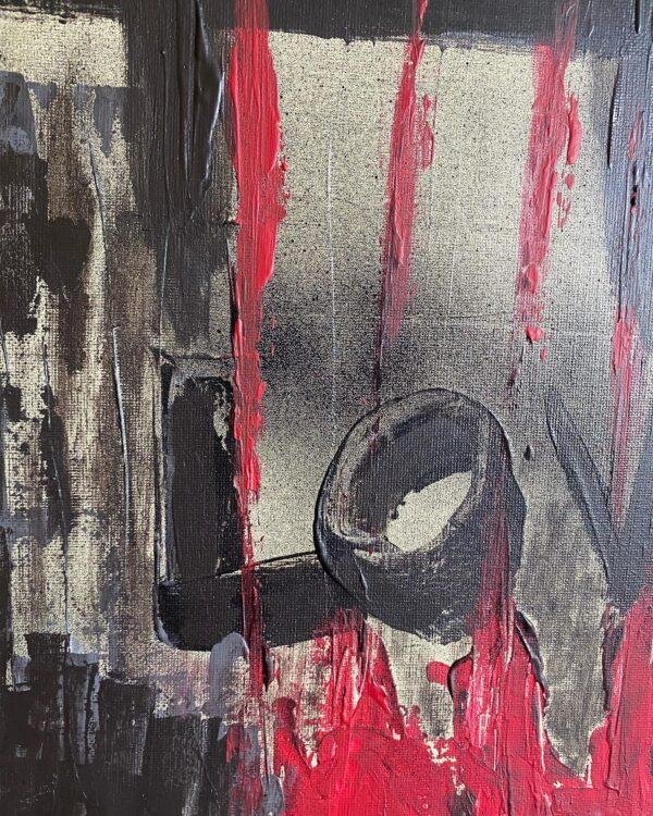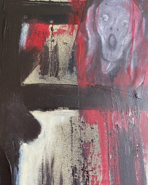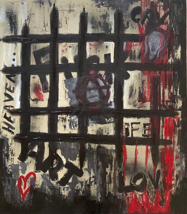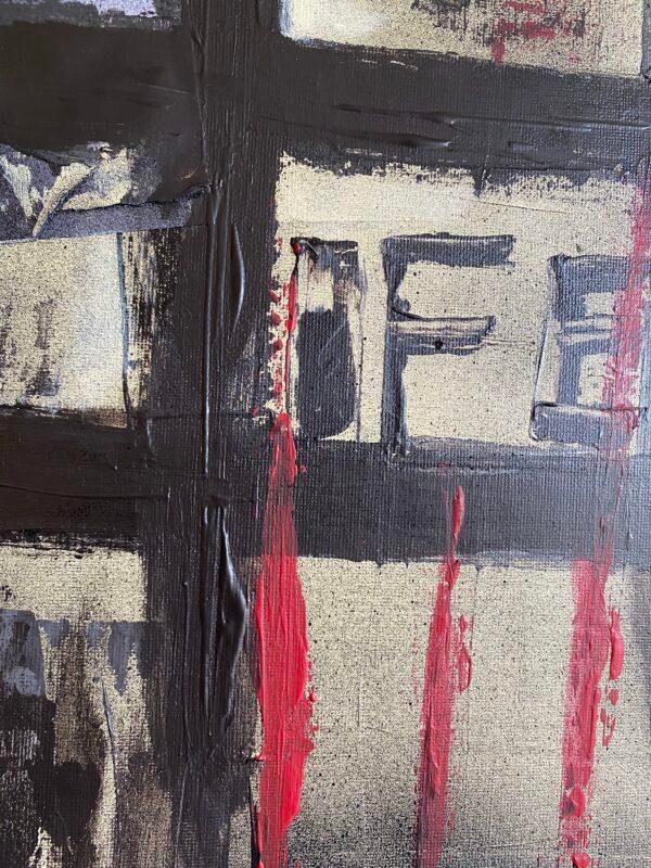 Acrylique, collages et bombe acrylique sur toile, réalisée aux couteaux.