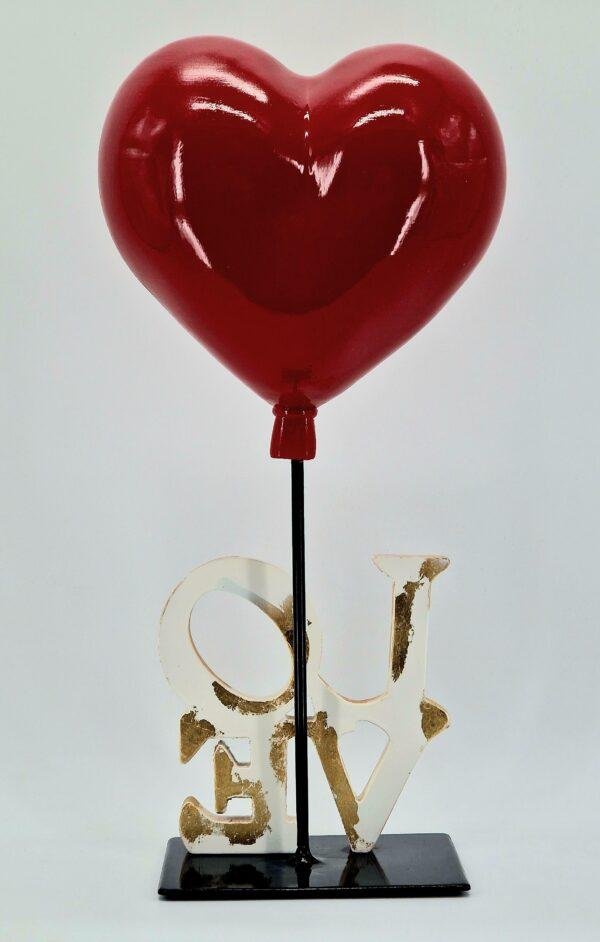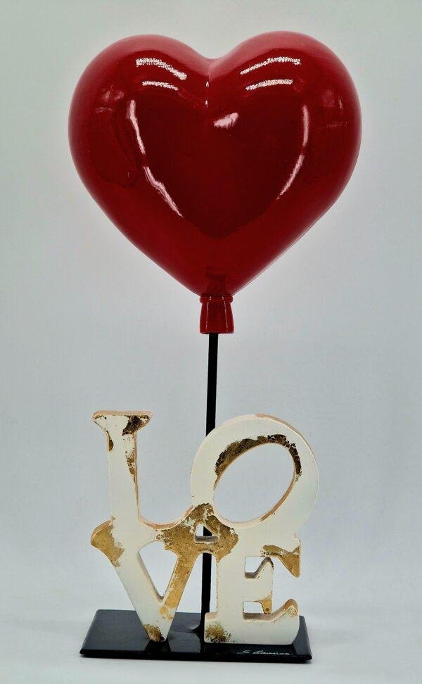 Le Love balloon est réalisé par impression 3D en PLA (Amidon de Maïs). le mot LOVE est en bois. ils reposent sur un socle en Fer peint en noir. ils sont peints à la bombe, des feuille de métal doré sont collés sur le mot love et l’ensemble est vernis.
