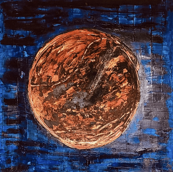 Interprétation toute personnelle de la planète Mars, pas si rouge que cela , plutôt orangée et déjà entachée de couleurs sombres .Subira t -elle les mêmes agressions que notre Terre ? Nous en sommes pas encore là … Sa calotte polaire sud rétrécit ! J’ai voulu la baigner dans un océan de bleu, ces bleus symbole de rêve , de sagesse et de fraicheur.