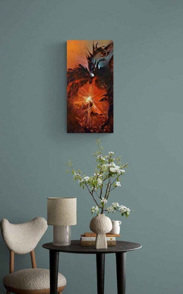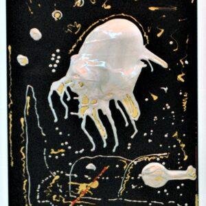 Dans cette œuvre, l’artiste aborde la métempsychose de façon inversée. Un animal qui pourrait être, un oiseau ou un dragon déployé en partie supérieure de la toile aborde l’instant de la métamorphose en un être humain matérialisé par un éclair.