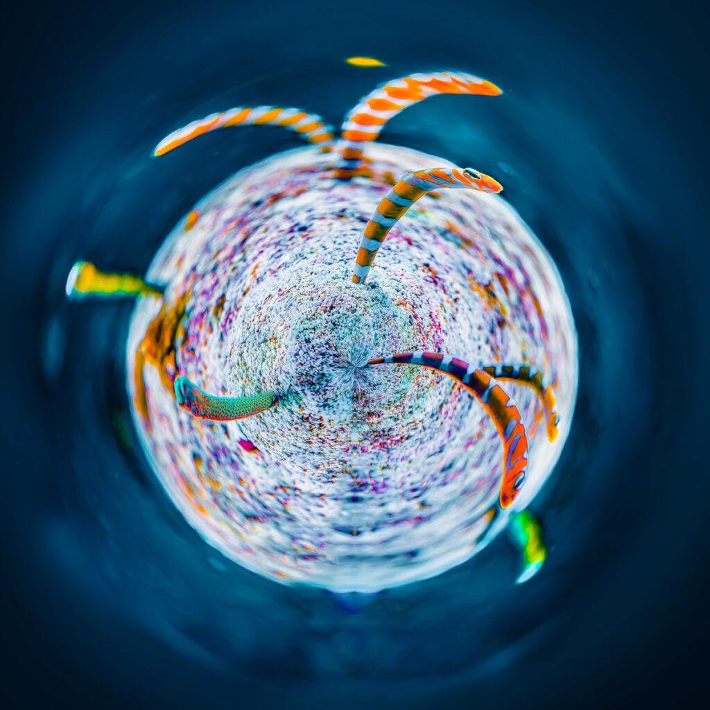 Anguilles jardinières tachetées ondulant avec grâce dans les courants colorés, pour une scène marine envoûtante.