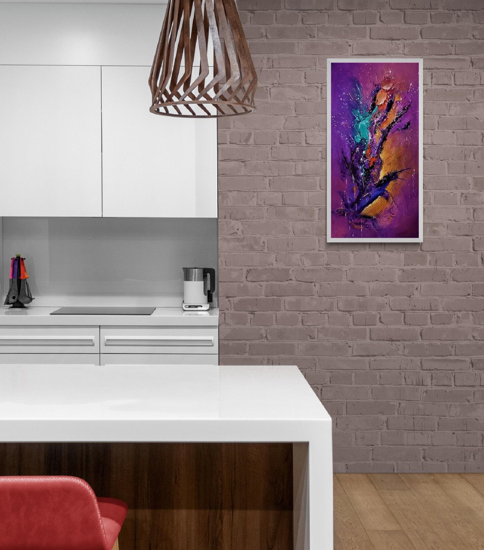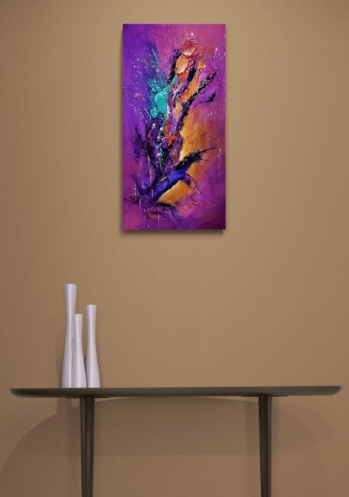 Les clous cachés et la tranche peinte permettent l’accrochage sans encadrement.