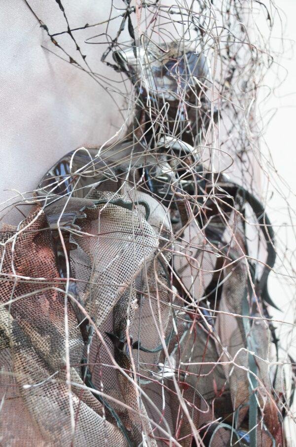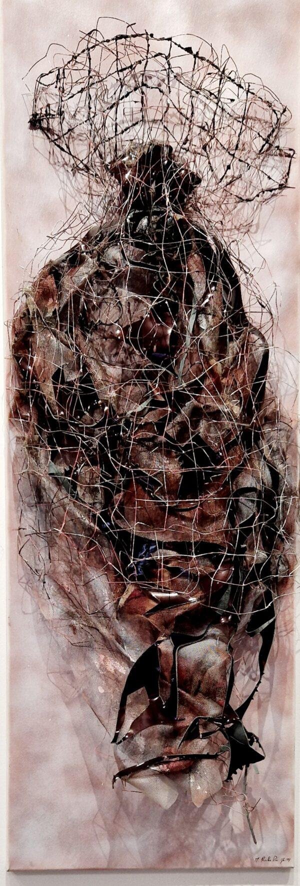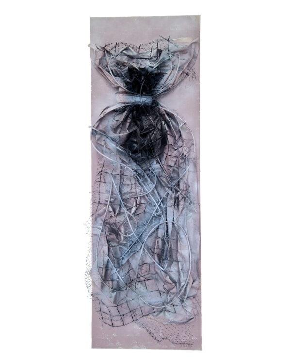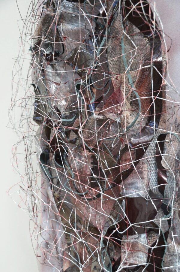 Acrylique, grillage, cuir vernis et tulle plastifié
