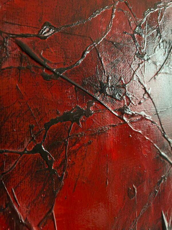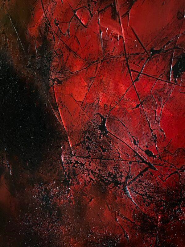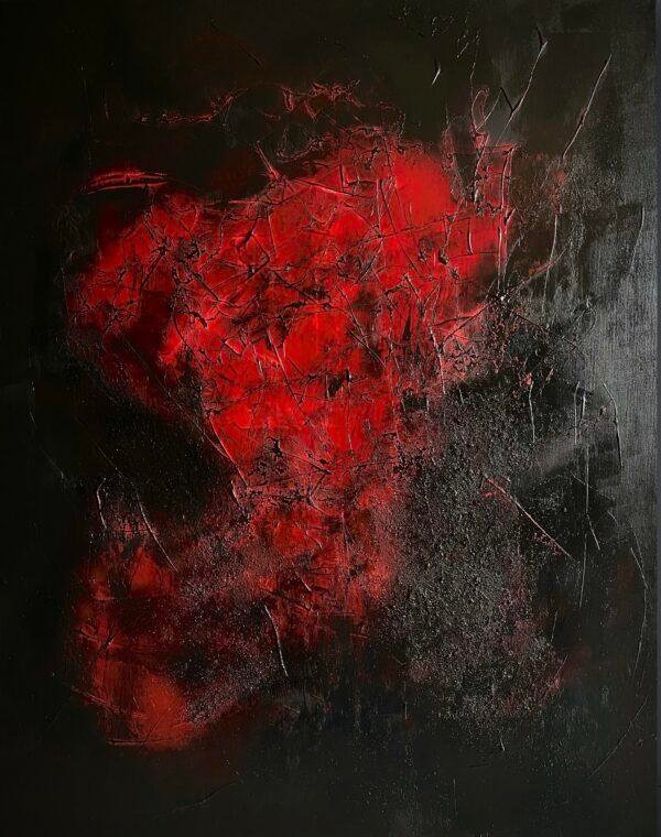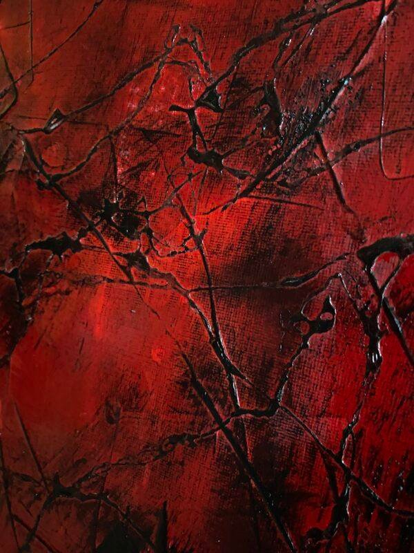 En peignant cette toile, je me suis sentie prise dans une dualité entre la lumière et l’obscurité. Le visage que l’on devine sur le rouge, et les traits de peinture noire, me font penser à une toile d’araignée. Elle évoque peut-être un sentiment de piège, ou de lien, et peut symboliser des réflexions complexes. Elle peut également suggérer une vulnérabilité, ou une sensation de danger imminent… d’où le titre.