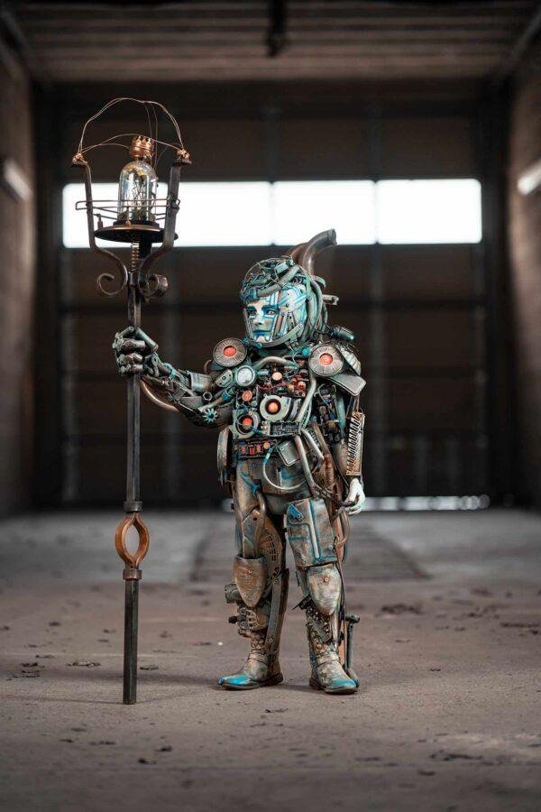 Prince 2150 est une sculpture cyberpunk-steampunk représentant un humanoïde hybride, fusionnant technologie et métal recyclé.