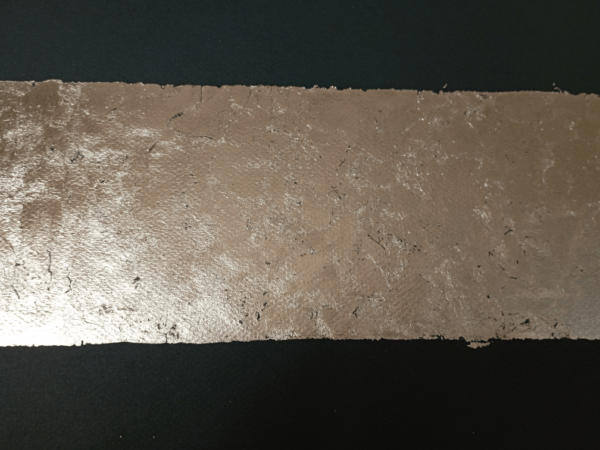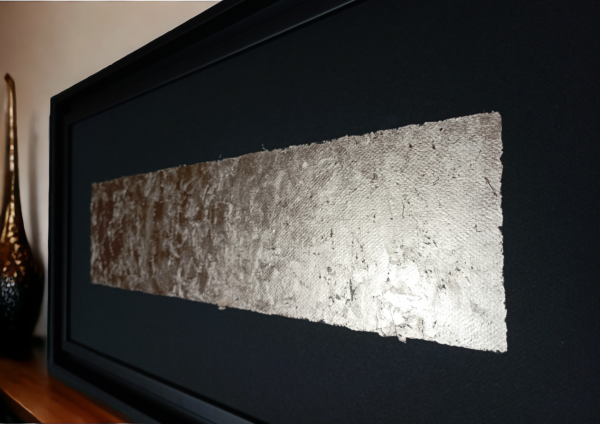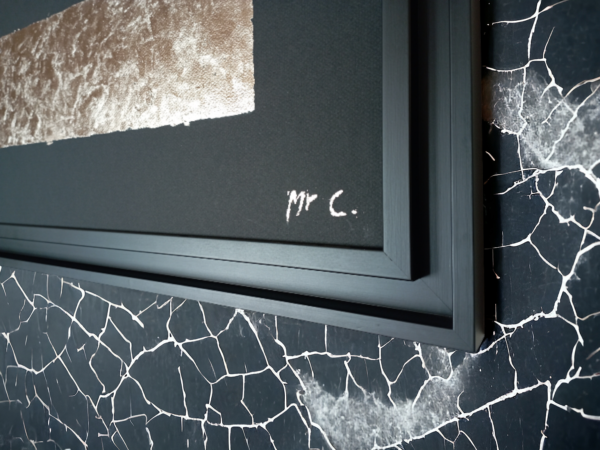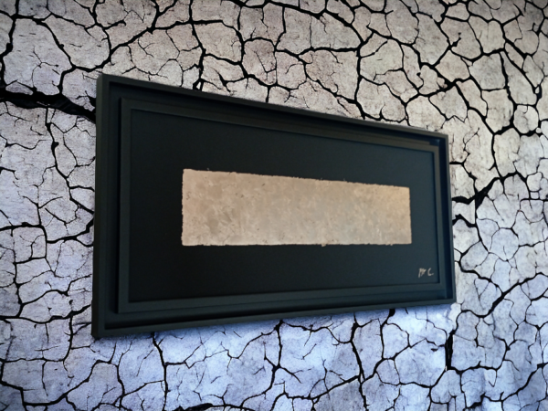 Attardez-vous sur le travail particulier de pose de la feuille d’or, cette méthode longue est fastidieuse n’a qu’un but : pousser au paroxisme la symbiose entre la matière et les angles de réflexion.