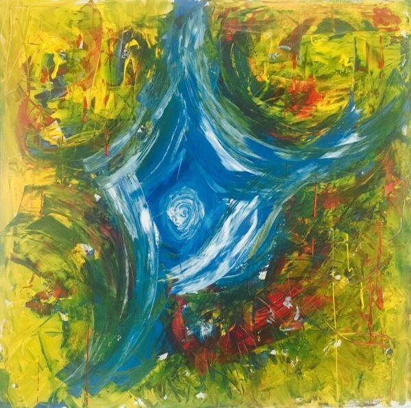 Lorsqu’une âme arrive sur terre, ici présentée au centre de la toile en blanc, un vortex de protection universelle se forme autour d’elle, le bleu représentant cet aspect spirituel. La protégeant ainsi de toute force extérieure que le jaune dynamique et le rouge illustrent. On peut voir apparaître différent visages, êtres , qui montrent bien cette agitation et présences extérieures, contrastant clairement avec le calme infini du bleu au centre. Les lignes courbes se rejoignent comme pour former une personne-un être qui porte en son centre la vie, la future naissance.