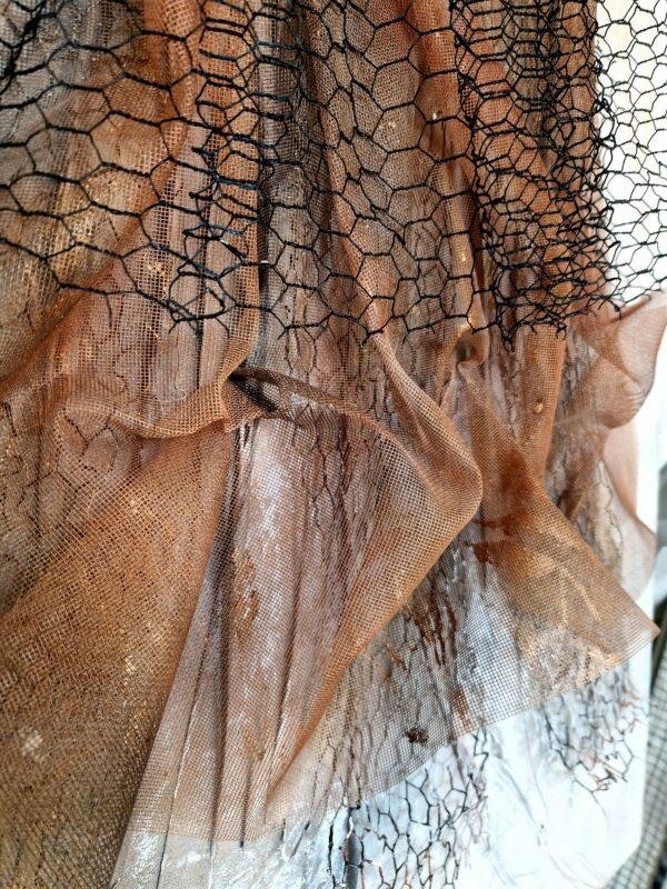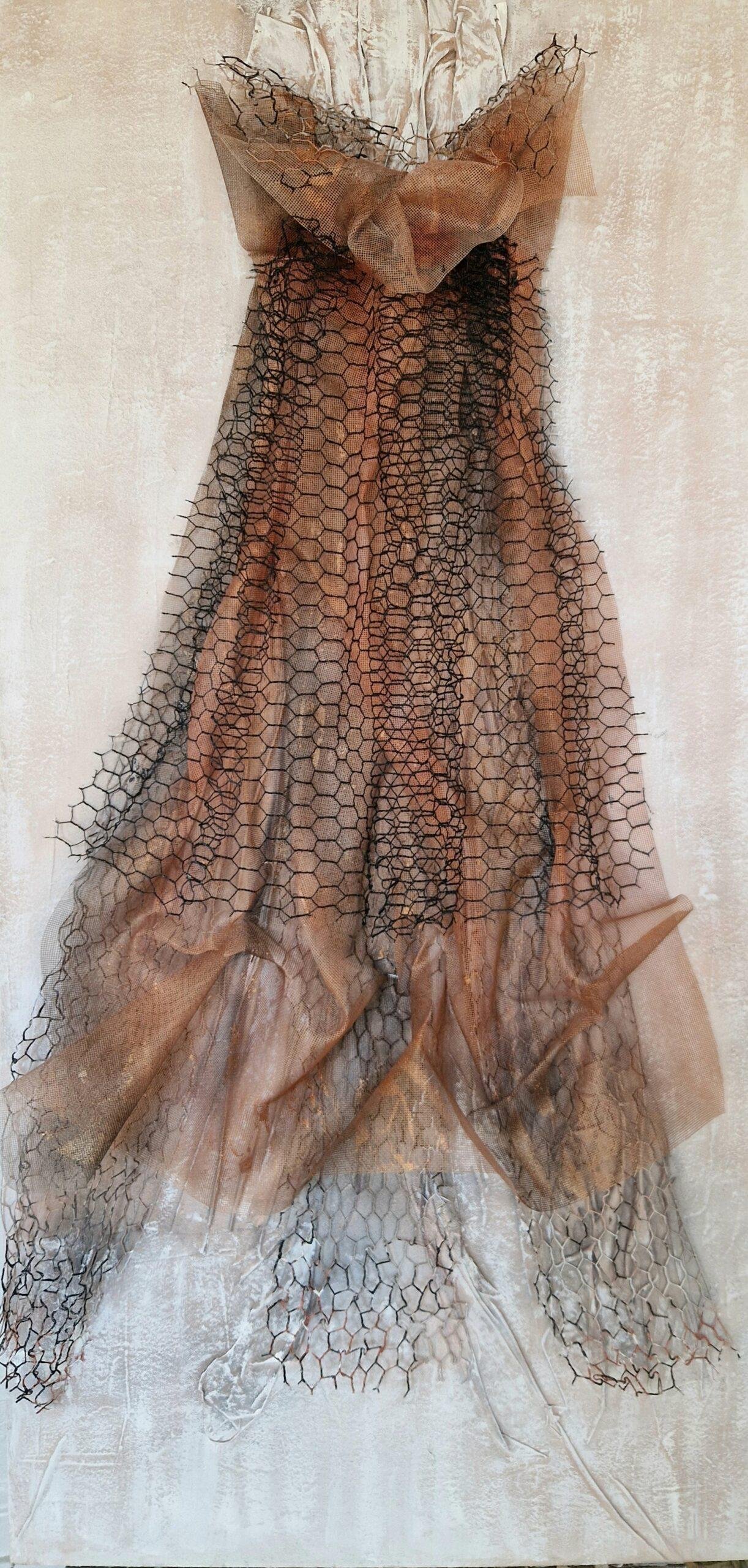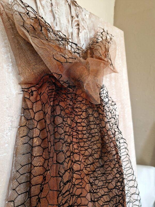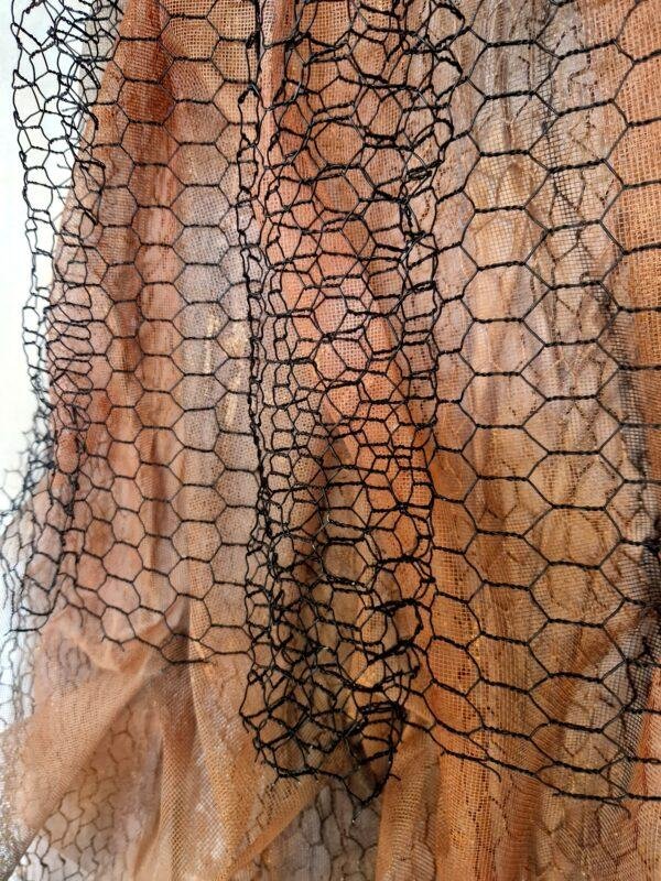 Une robe de grillage aux tons roses, où la force brute rencontre la délicatesse.