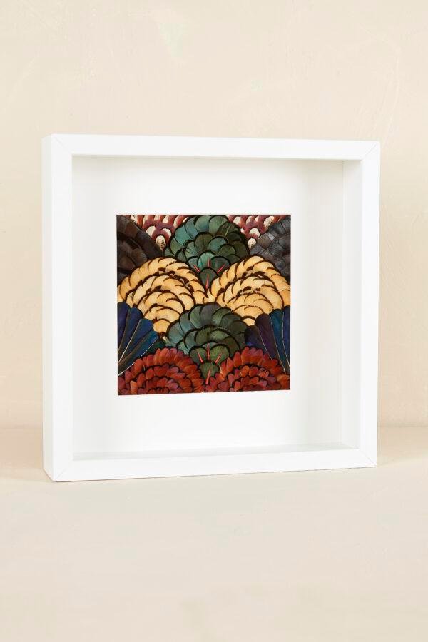 Motif art deco , répétition japonaise, soleil levant. Les plumes arrivent toujours à former un paysage serein et poétique. Elles dialoguent entre elles et prennent vie.
