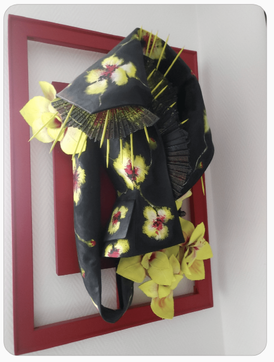 Les motifs floraux peints à la main dialoguent avec des éléments rigides et pointus, inspirés d’une esthétique japonisante. Les références à l’éventail et à l’armure traduisent mon intérêt pour la tension entre délicatesse et protection, ornement et contrainte.