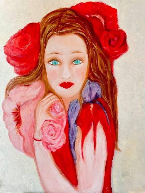 Dans cette œuvre, une figure féminine émerge d’un écrin de fleurs, portée par une palette chaude et veloutée. Le regard turquoise, à la fois lointain et présent, capte le spectateur dans une intimité suspendue.