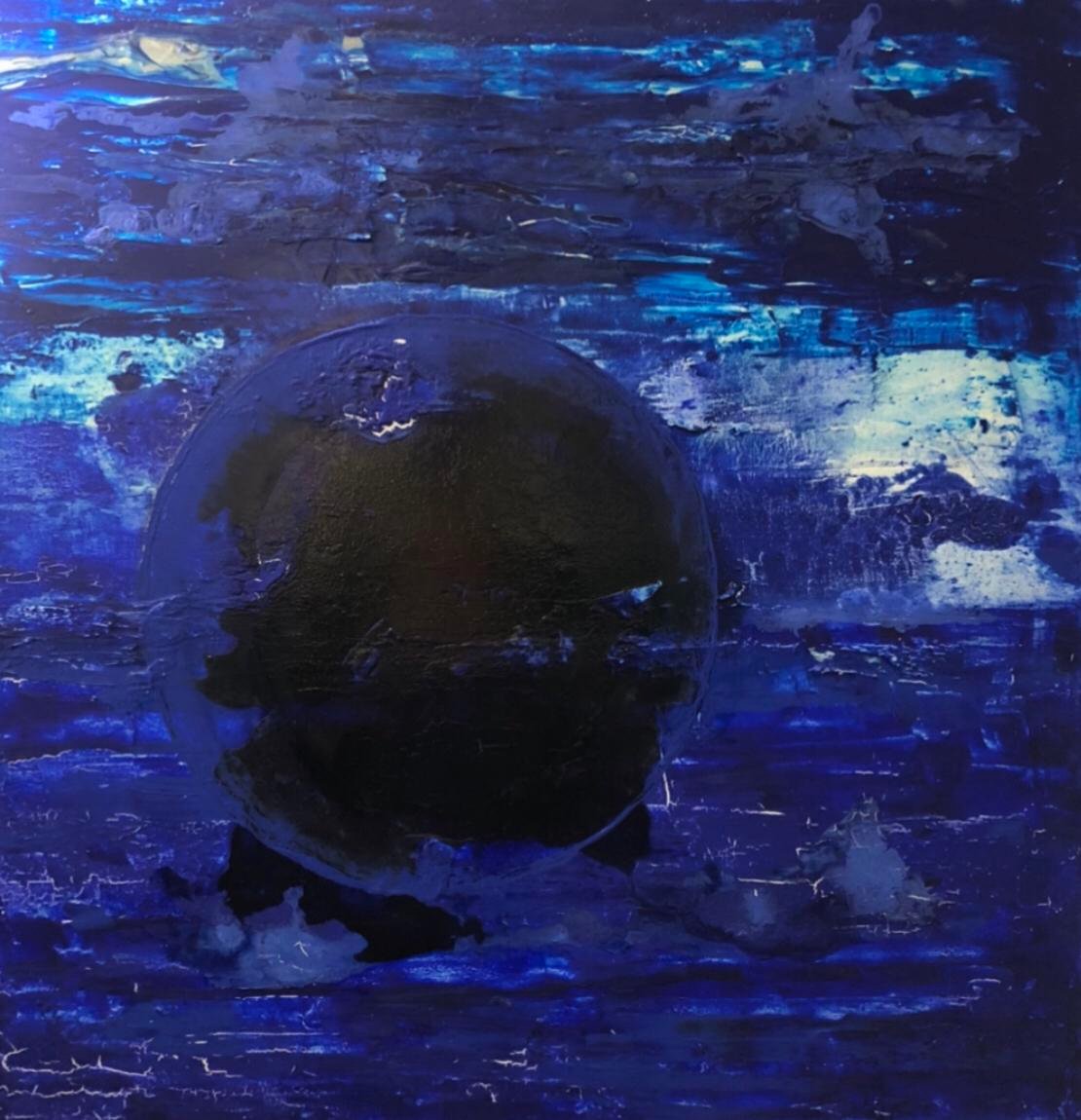 Le titre de cette toile évoque la simplicité des bleus dans leur réalisation. On imagine la terre, cette planète bleue naviguant au gré des océans. Elle semble contenir les assauts, robuste et ancrée .