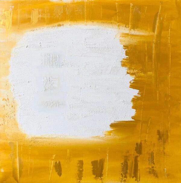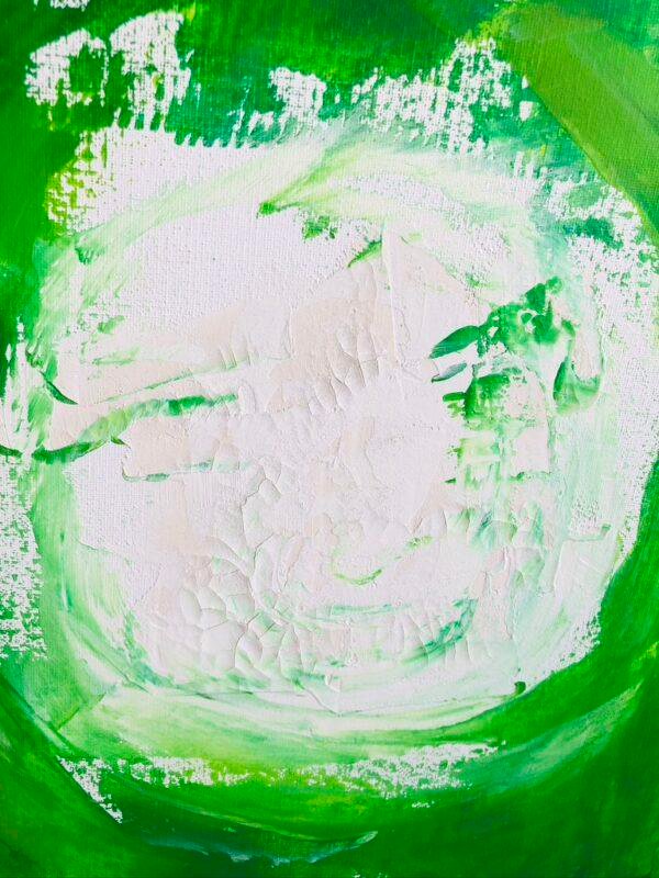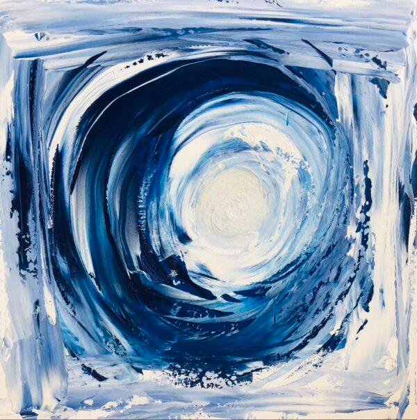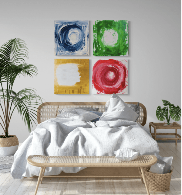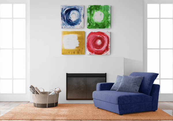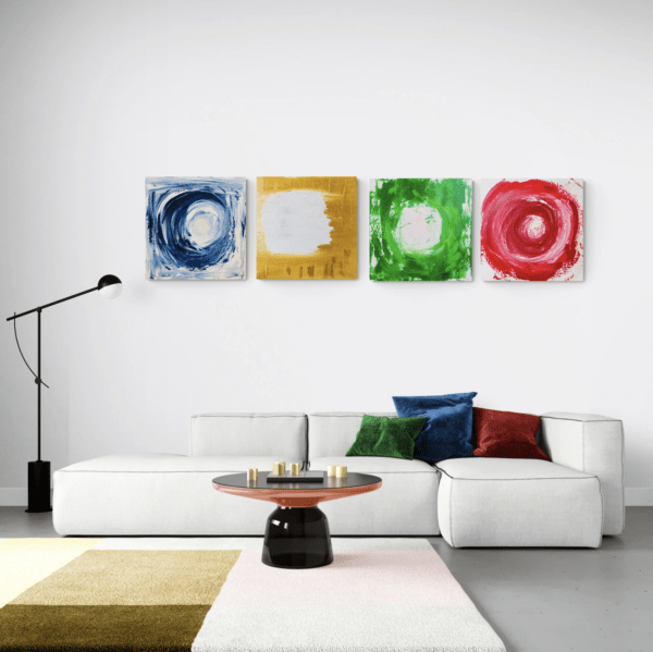 Quadriptyque qui représente l’esprit des 4 éléments appartenant à notre planète Terre: l’eau (bleu), l’air (blanc-jaune), la terre (vert) et le feu (rouge).