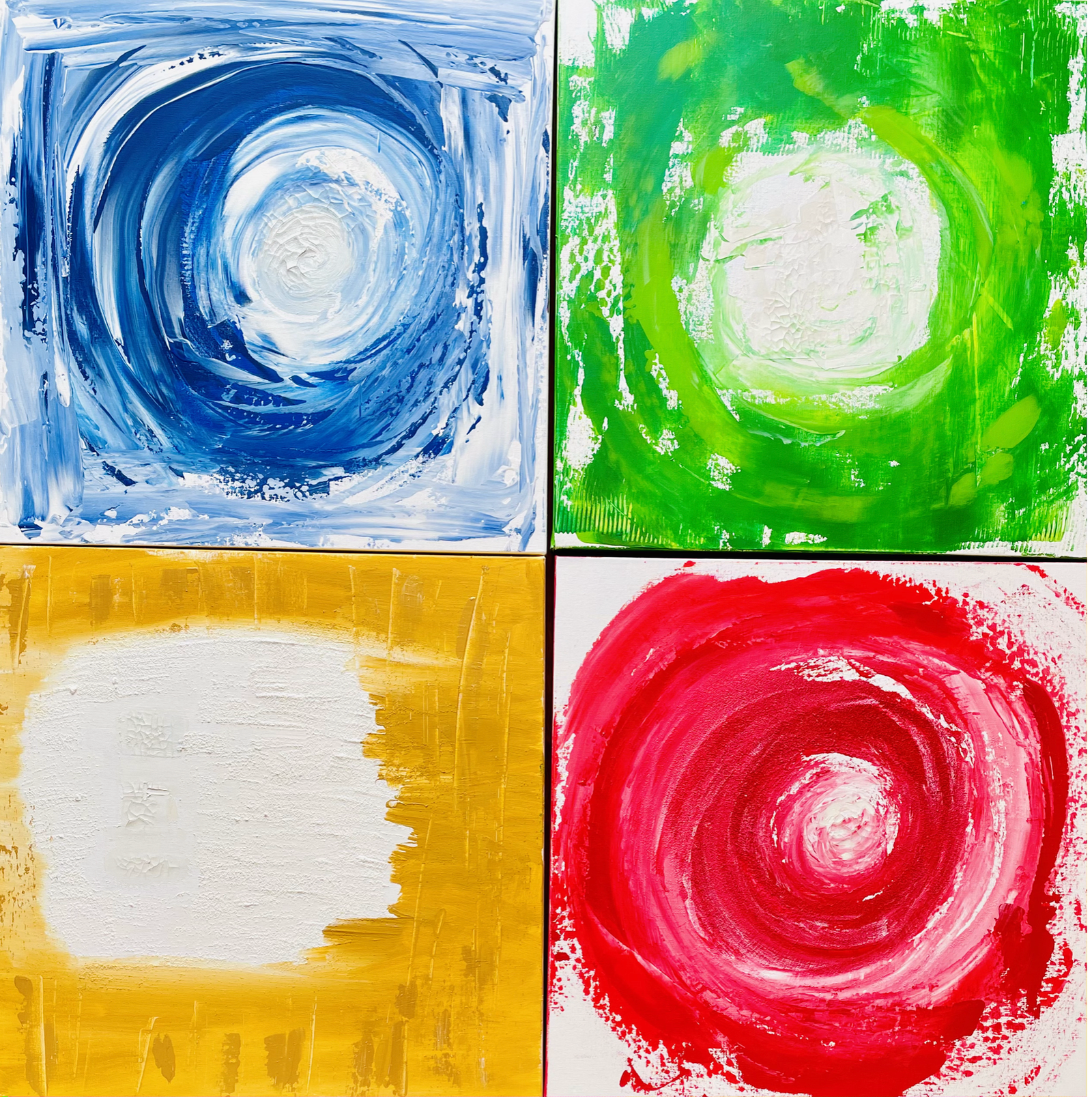 Quadriptyque qui représente l’esprit des 4 éléments appartenant à notre planète Terre: l’eau (bleu), l’air (blanc-jaune), la terre (vert) et le feu (rouge).
