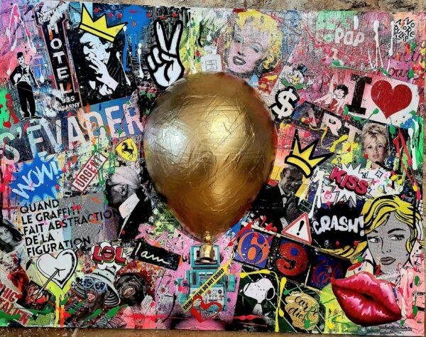 Les images sont issues de la presse, BD, etc, représentant des icônes du monde de l’art. la dominante de l’or sur le ballon est la représentation du monde de l’art dans la vie actuelle avec une vision du luxe.