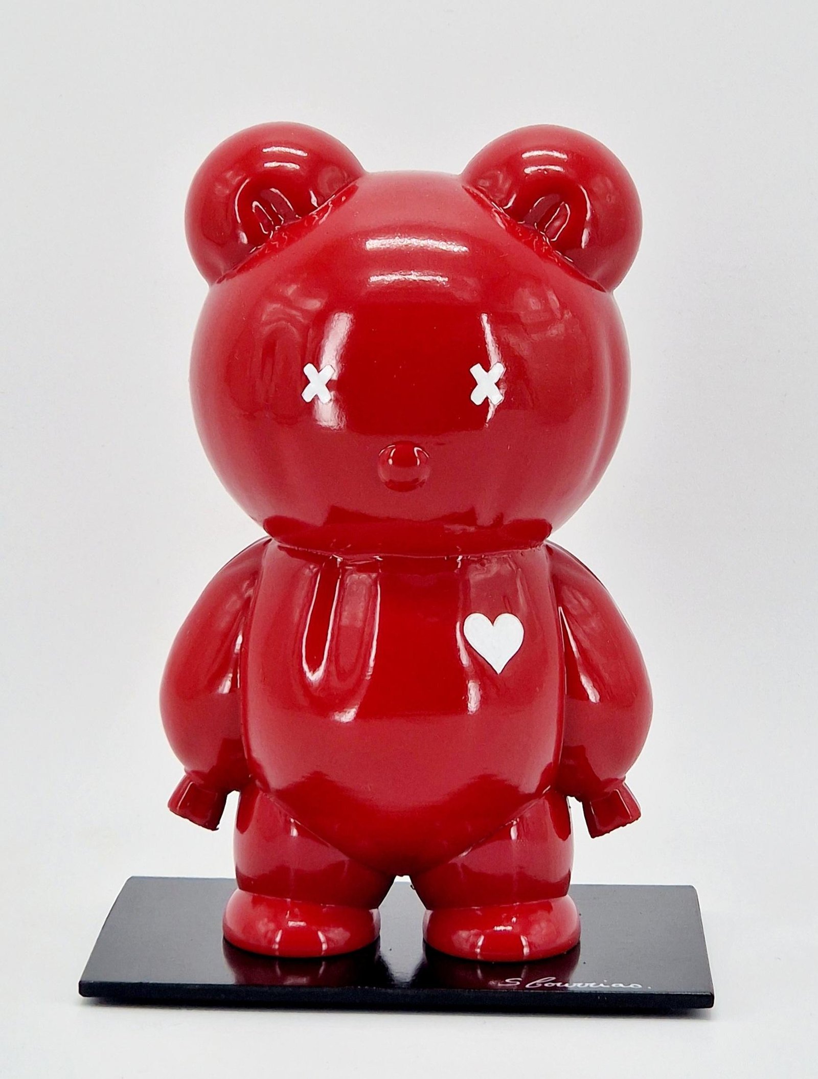 Le Teddy balloon est réalisé par impression 3D en PETG (matière plastique robuste et durable). il repose sur un socle en fer forgé. il est peint à la bombe et vernis.