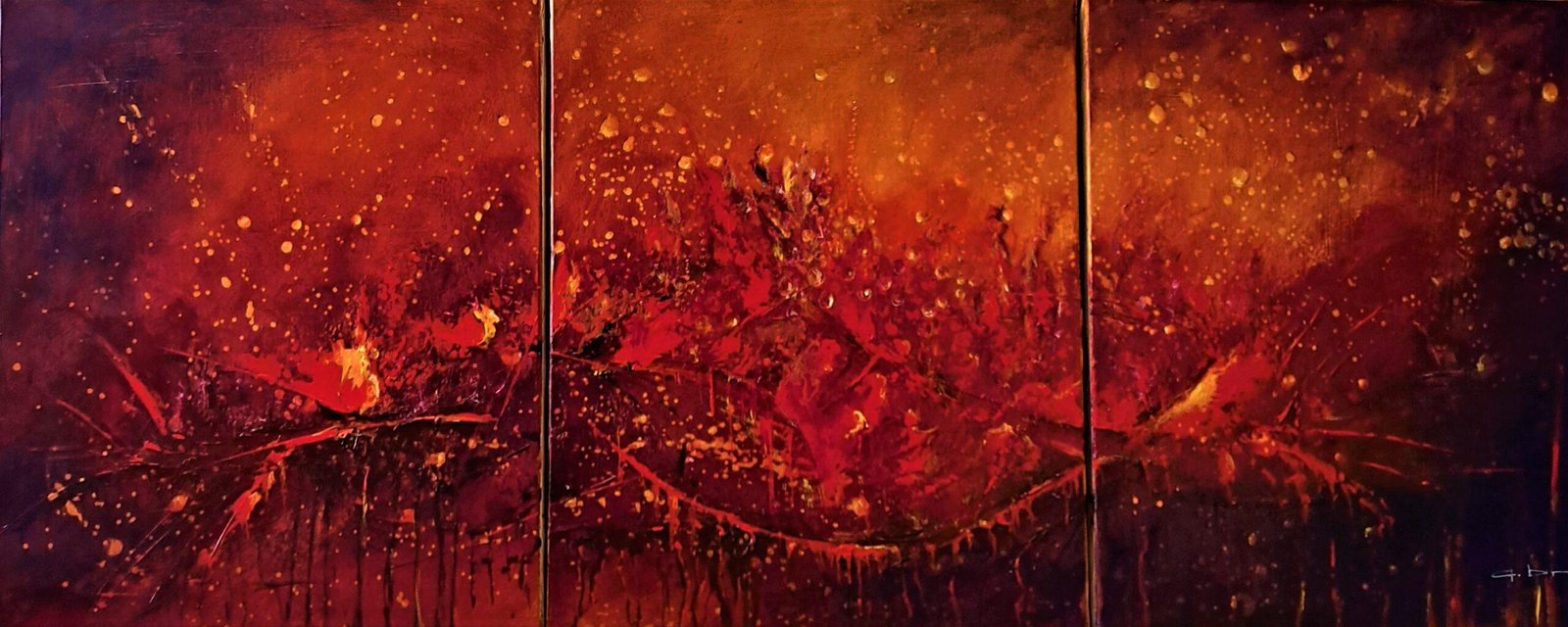 Dans ce triptyque, l’artiste imagine une tempête solaire encore appele éruption solaire pour évoquer l’un de ses thèmes favoris : les énergies, à l’origine de la vie sur Terre mais aussi une sorte de métaphore du dépassement de soi qui permet de se sortir de situations délicates ou désespérées.