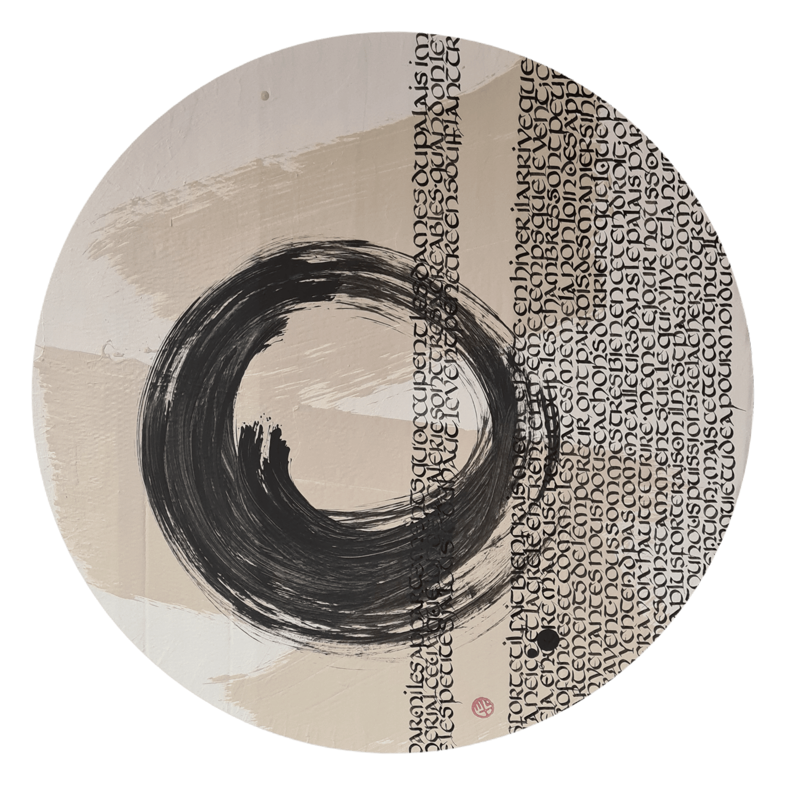 Cette calligraphie fait partie d’une série sous forme de tondo. J’ai calligraphié en onciale des extraits du Livre de Chevet de Sei Shônagen (Japon XIe siècle). Ce texte devient l’architecture de la composition faite de plusieurs superpositions de gestuelles. L’onciale est une écriture utilisée à partir du VIe siècle après JC, la plupart du temps pour des textes sacrés, je l’écris telle qu’elle l’étais à l’époque, à savoir quasi pas d’espace entre les mots, ni les lignes. De ce fait le texte devient une masse presque illisible, mais efficace pour la composition globale, le reste est réalisé avec des outils de récupération. Le support est en carton, construit par mes soins.