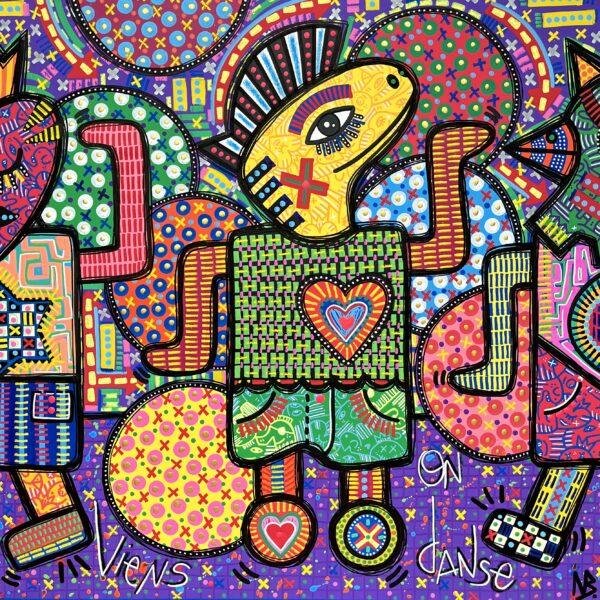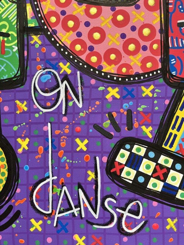 « Viens on danse » est une peinture mouvante et vibrante composée de trois Pop’Monsters qui dansent.